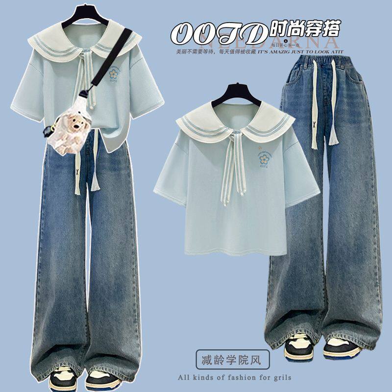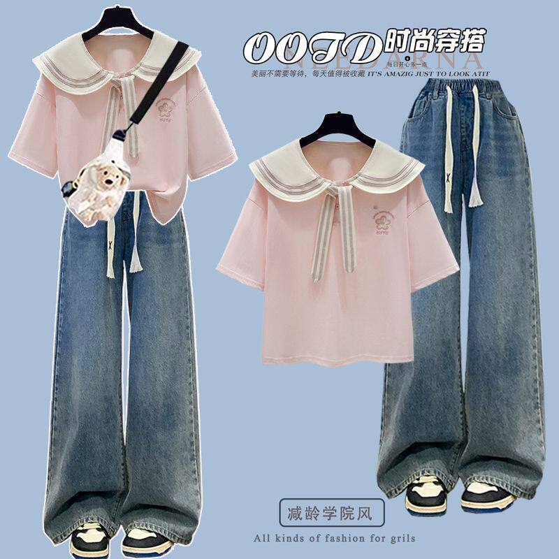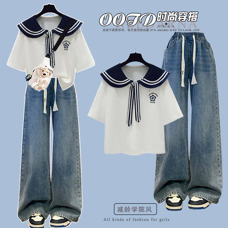 高中初中女孩夏季短袖套装少女大童青少年时尚学院风牛仔裤两件套