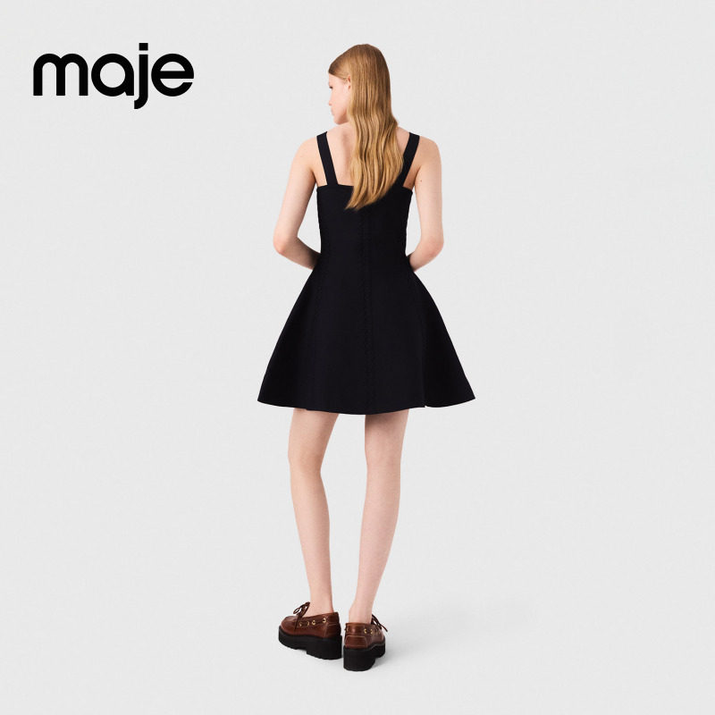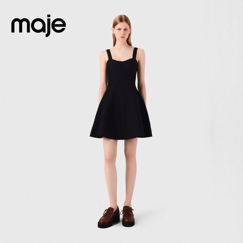 Maje经典款春夏女装法式优雅深蓝色短款收腰A字吊带针织连衣裙