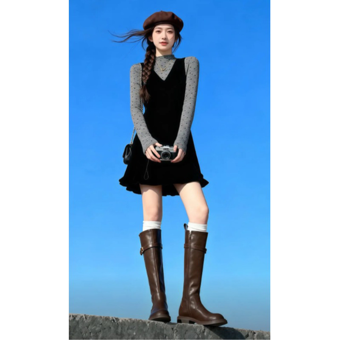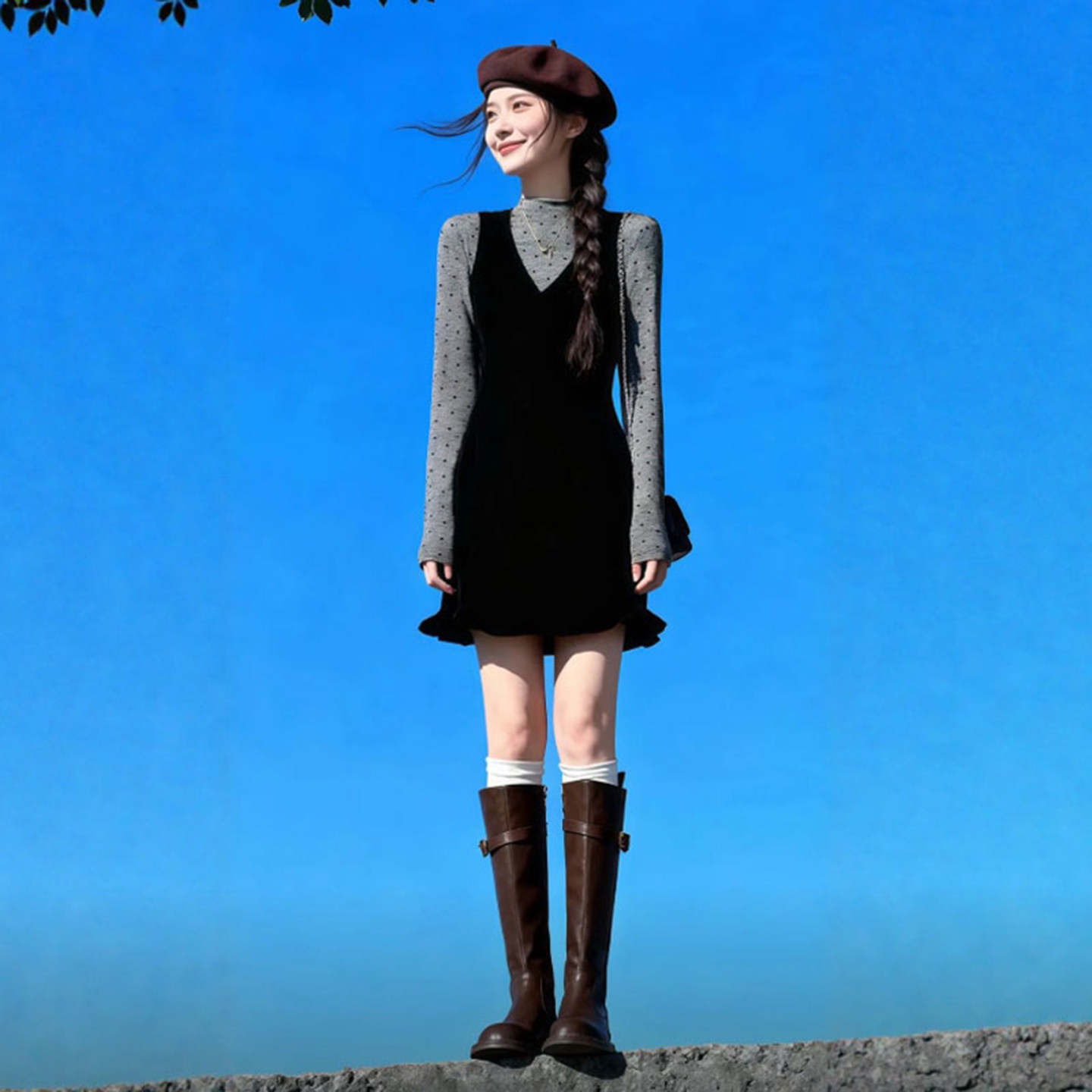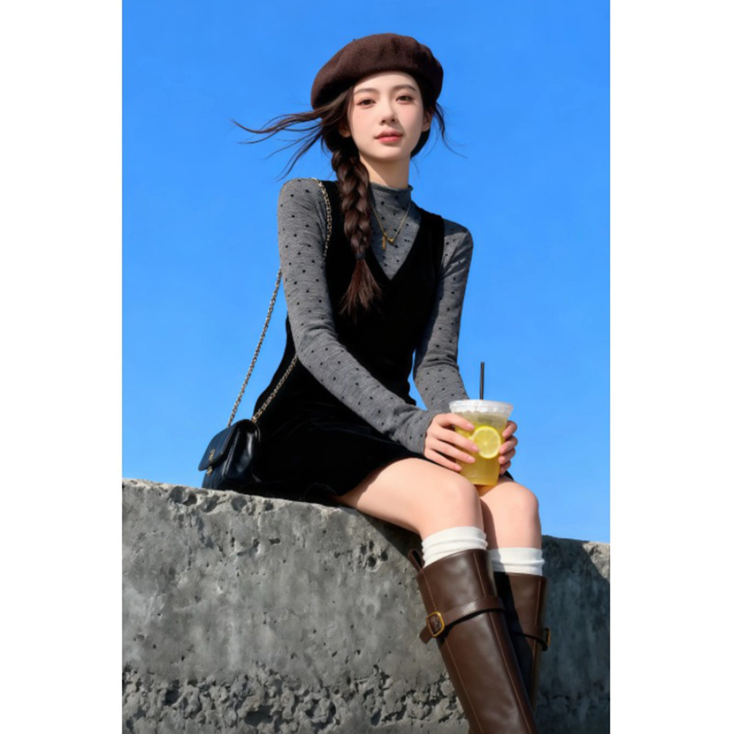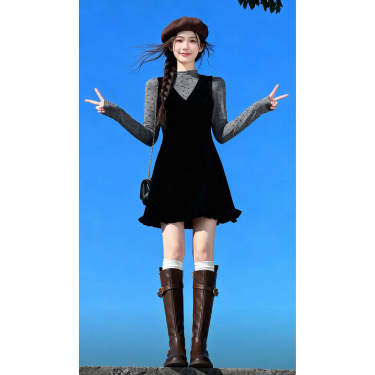 复古千金感V领黑色丝绒连衣裙子女时尚秋冬款显瘦花边短款背心裙