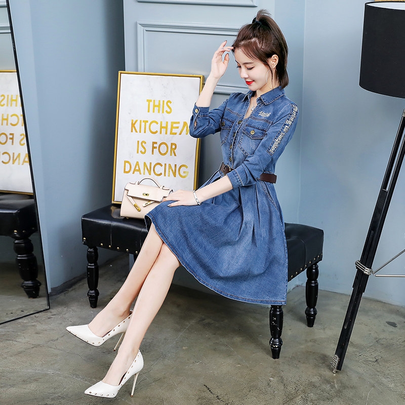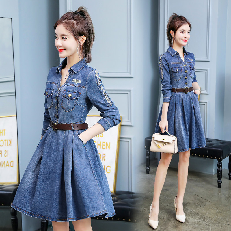 刺绣牛仔连衣裙女长袖2026春季款新款港味收腰显瘦洋气减龄牛仔裙