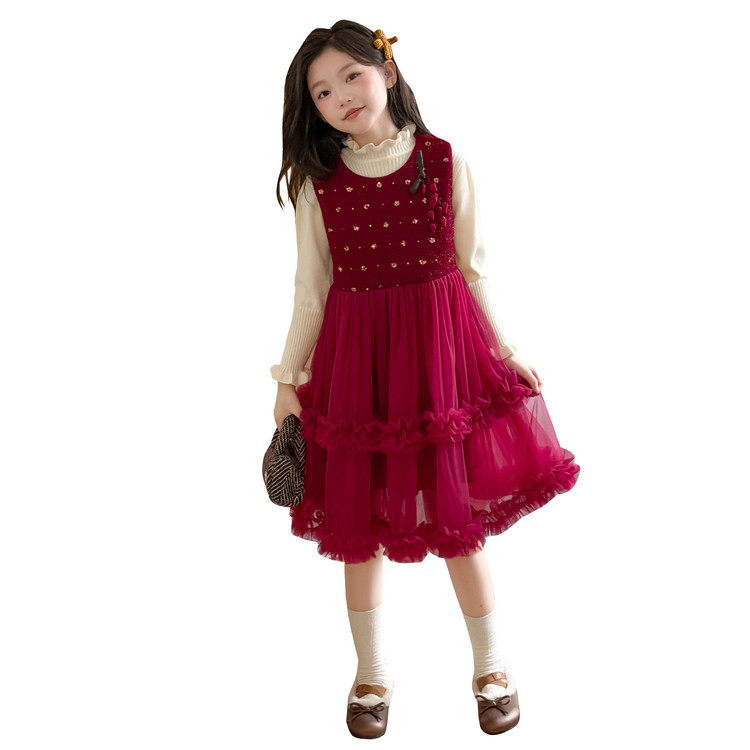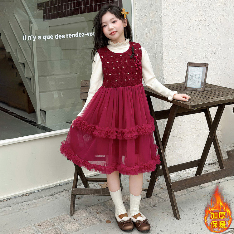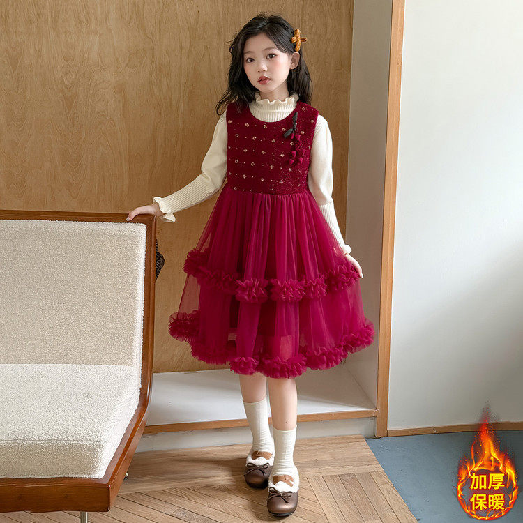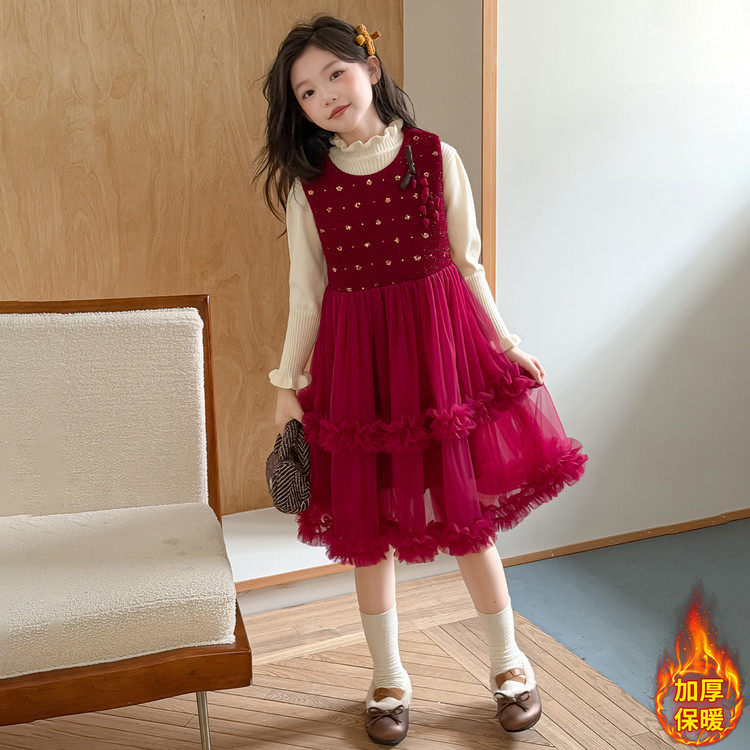 女童冬季连衣裙无袖加厚亮片红色年服公主纱裙2025新款中大童套装