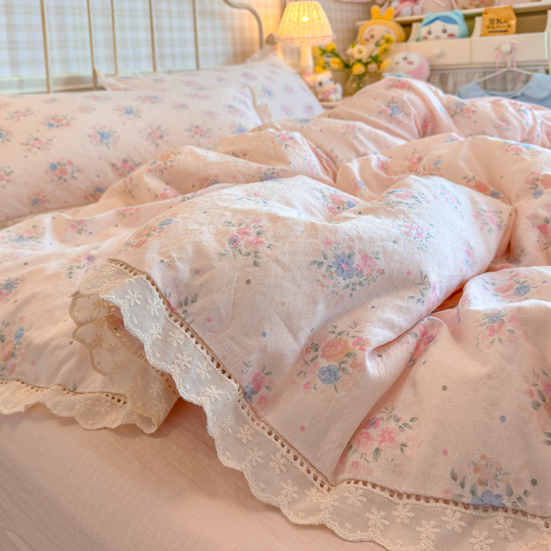 A类双层纱纯棉床上四件套2025新款全棉花边被套床单宿舍三件套