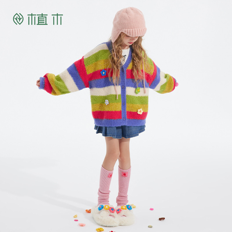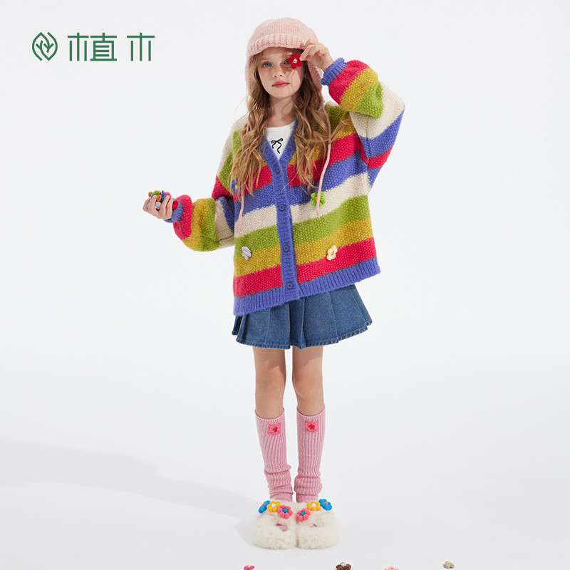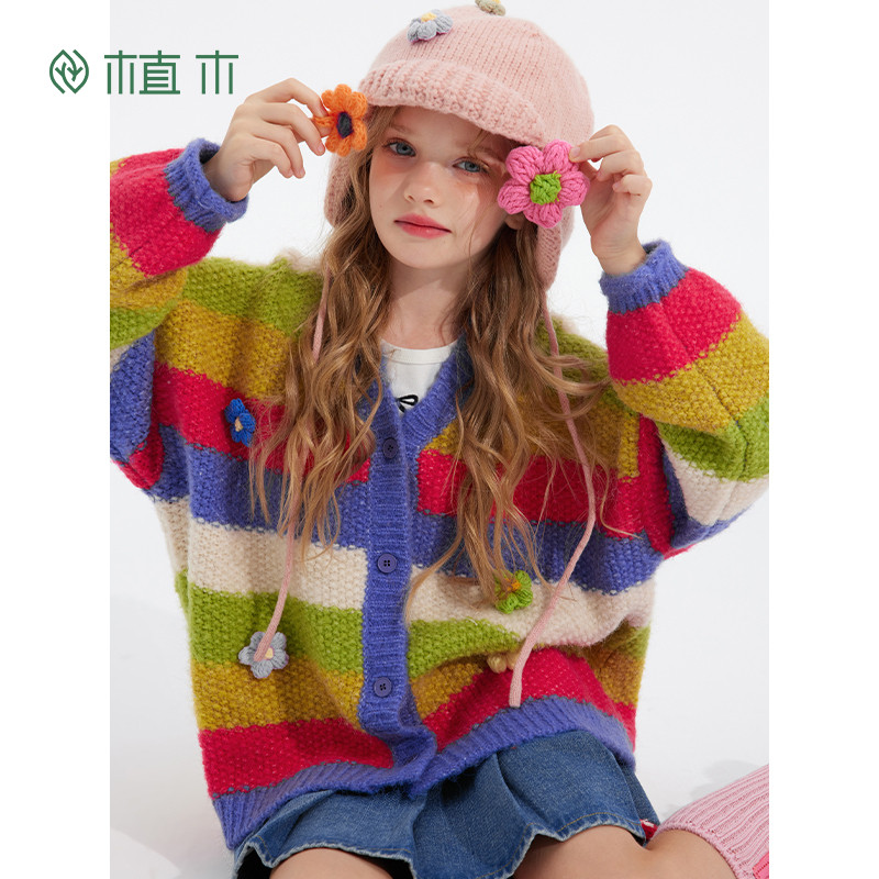 311线报网描述:女童彩虹条纹V领毛衣 立体花朵装饰针织开衫