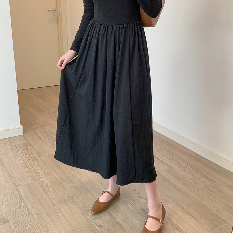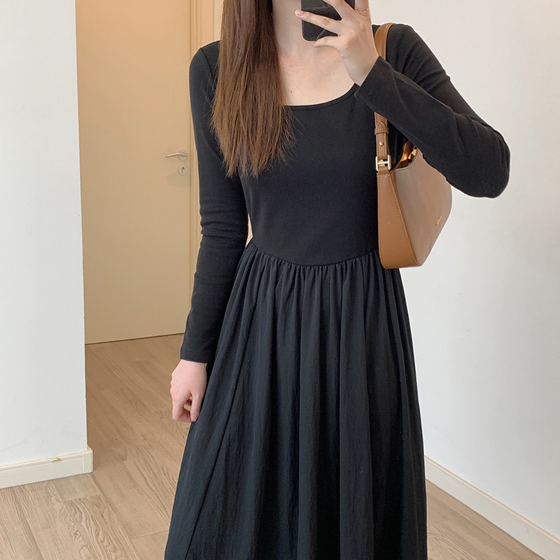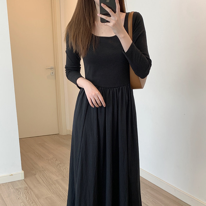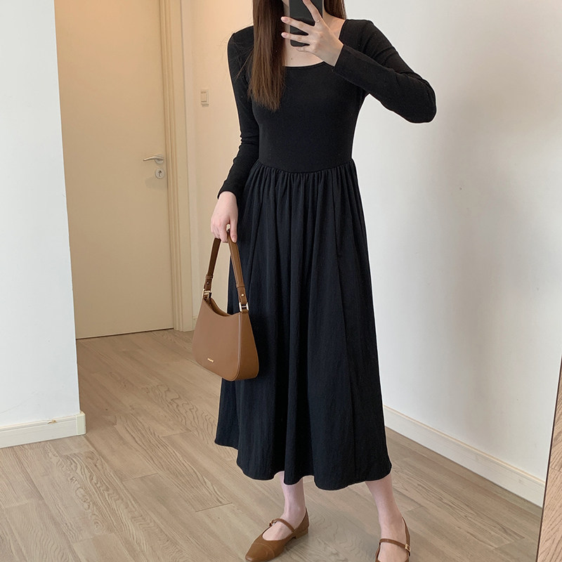 U领长袖针织连衣裙女早秋新法式气质高级感收腰显瘦a字拼接长裙