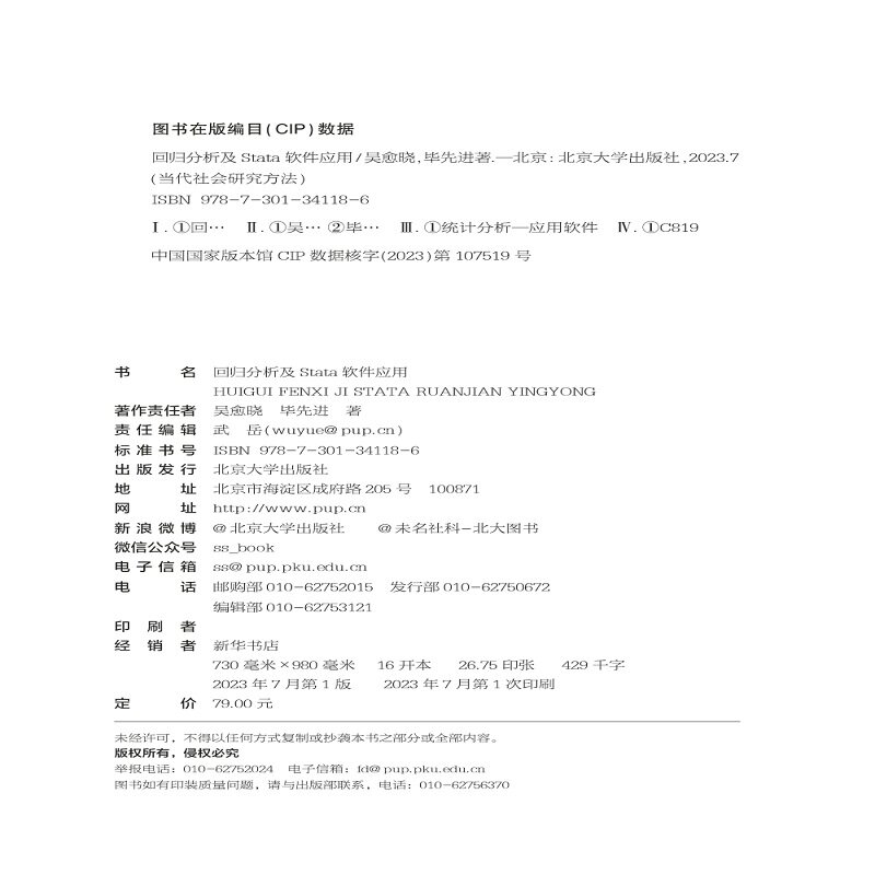 回归分析及Stata软件应用 吴愈晓 毕先进 中文版 北京大学出版社 9787301341186