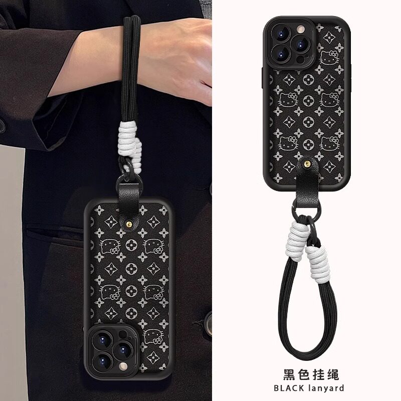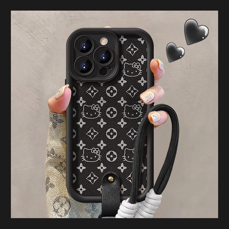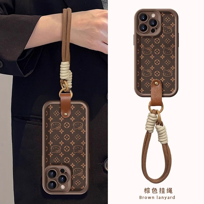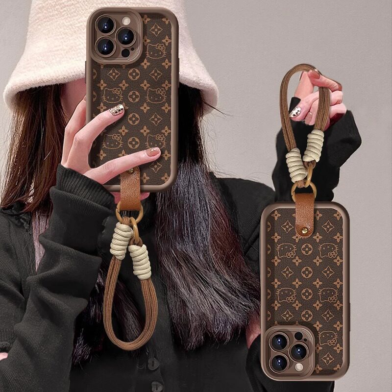 满屏凯蒂猫适用苹果17promax手机壳iPhone16promax保护套15复古14咖色小羊皮13pro秋冬11腕带挂绳12全包防摔