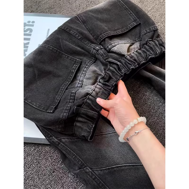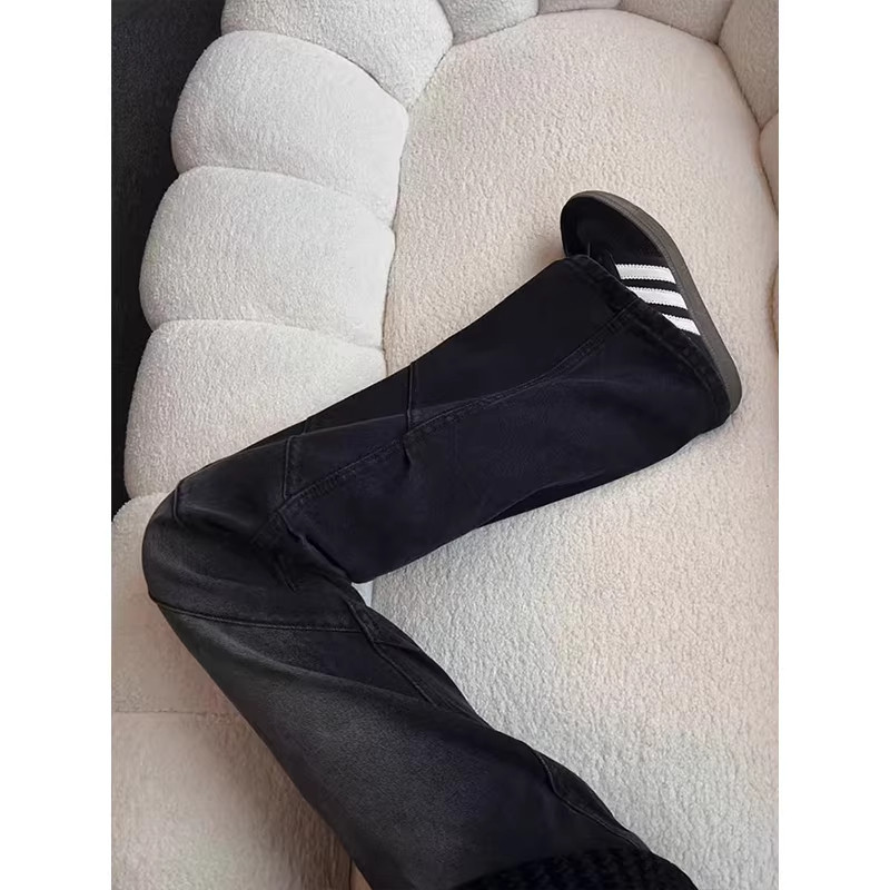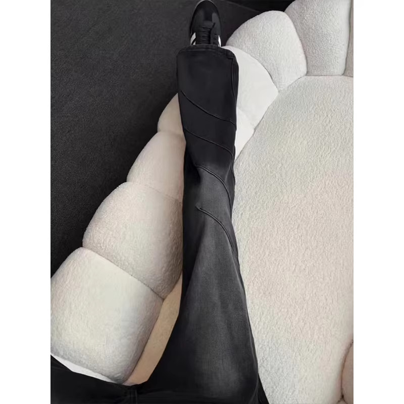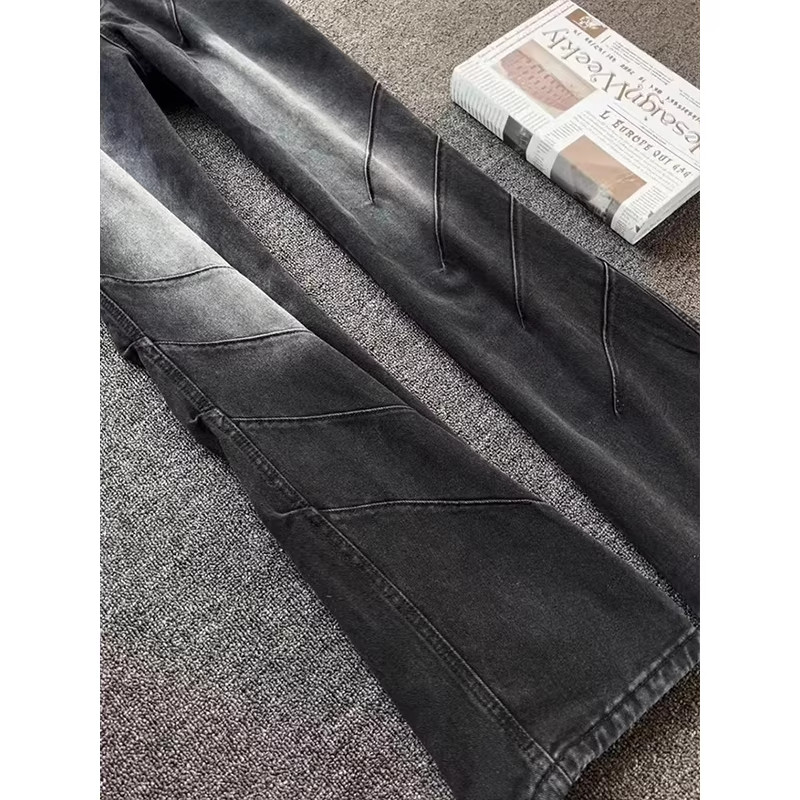 美式复古黑色褶皱牛仔裤男款春季痞帅设计感裤子弯刀直筒微喇长裤