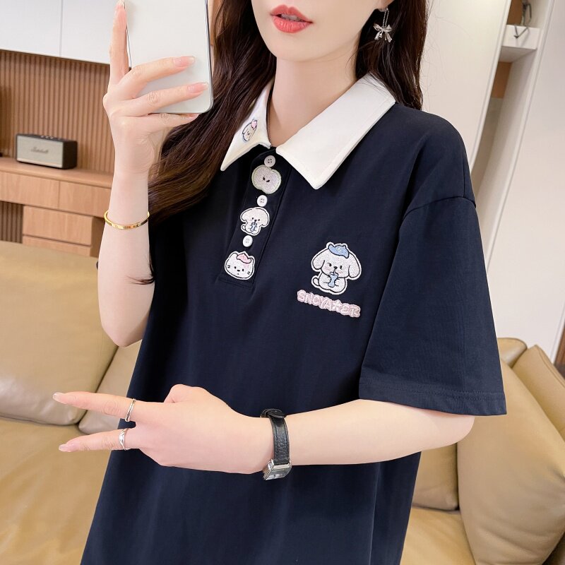 初中生可爱刺绣翻领T恤女夏新款高中学生潮流ins时尚宽松短袖上衣