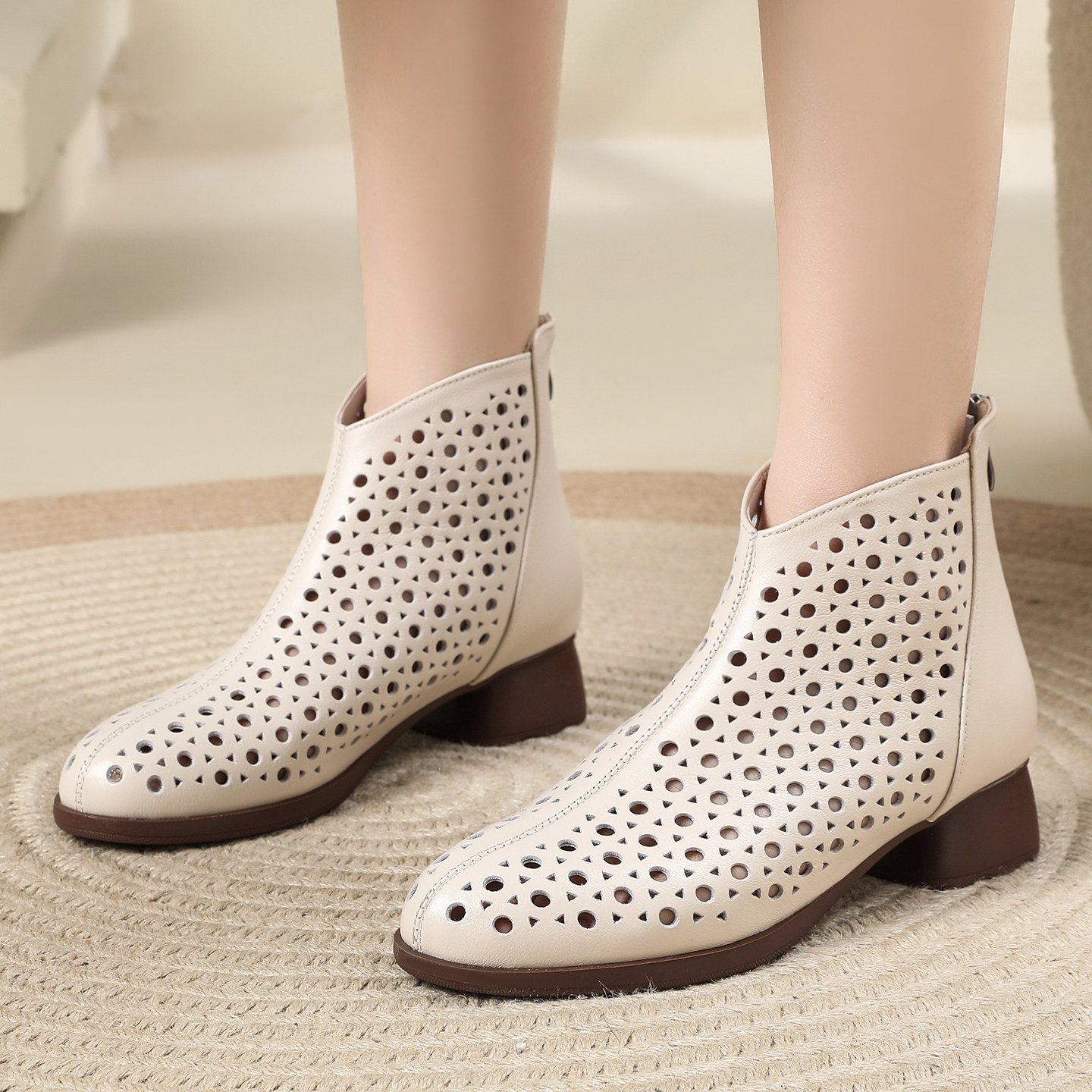 真皮镂空短靴2026春夏百搭软底妈妈鞋大码粗跟女鞋不累脚低跟凉靴