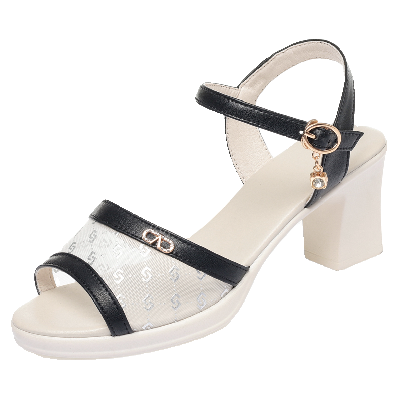 女士凉鞋2026新款夏季粗跟时装中年妈妈真皮网纱高跟鞋不累脚软底
