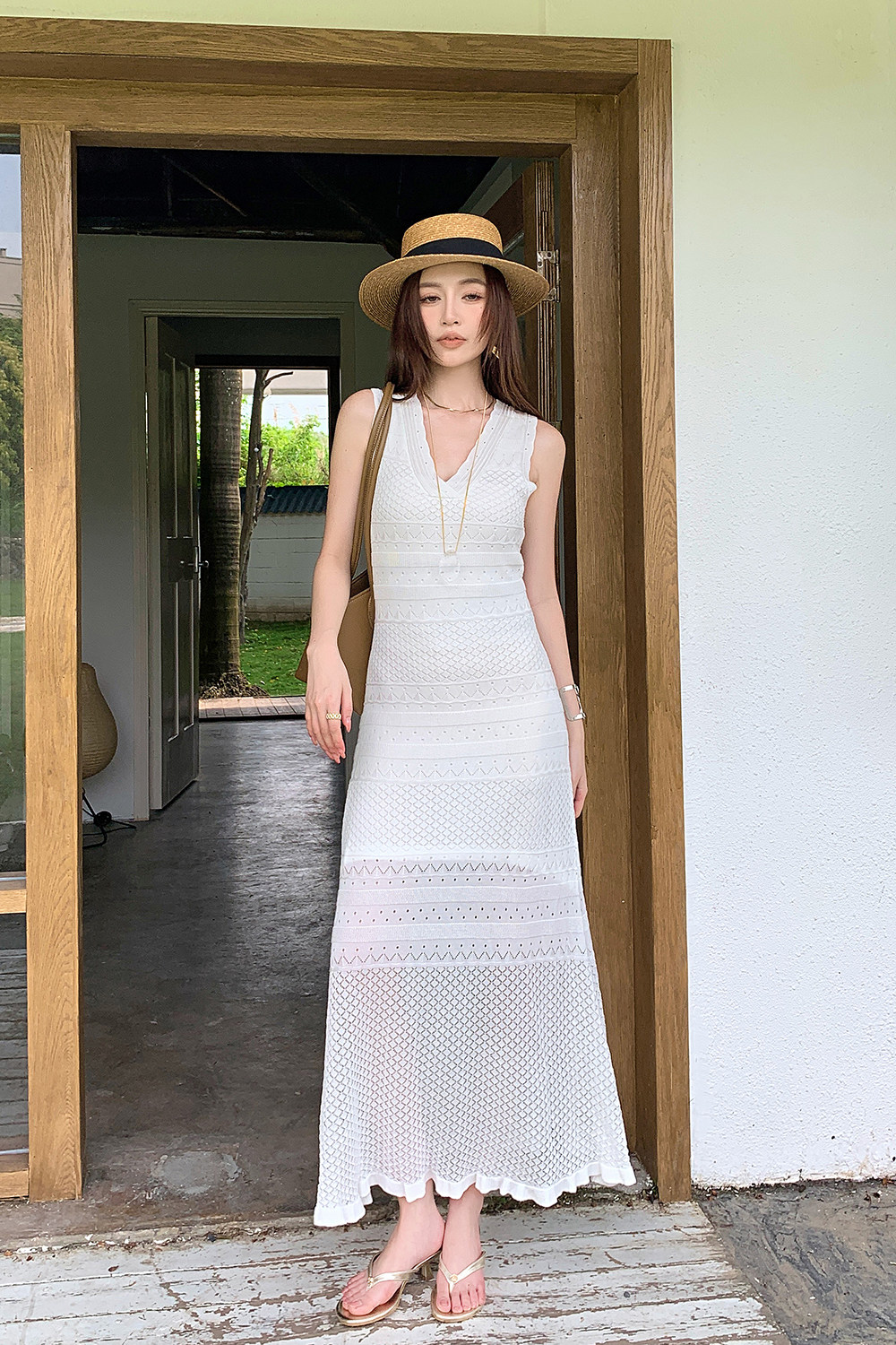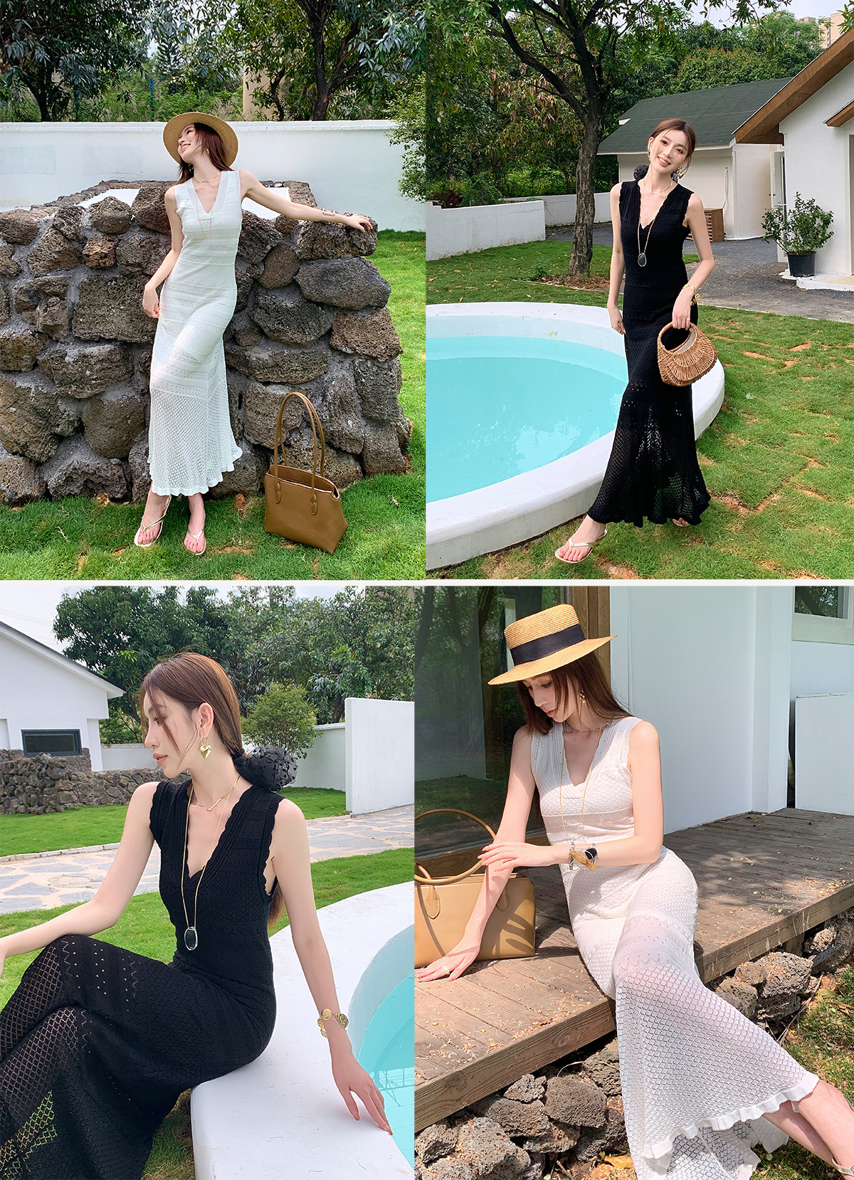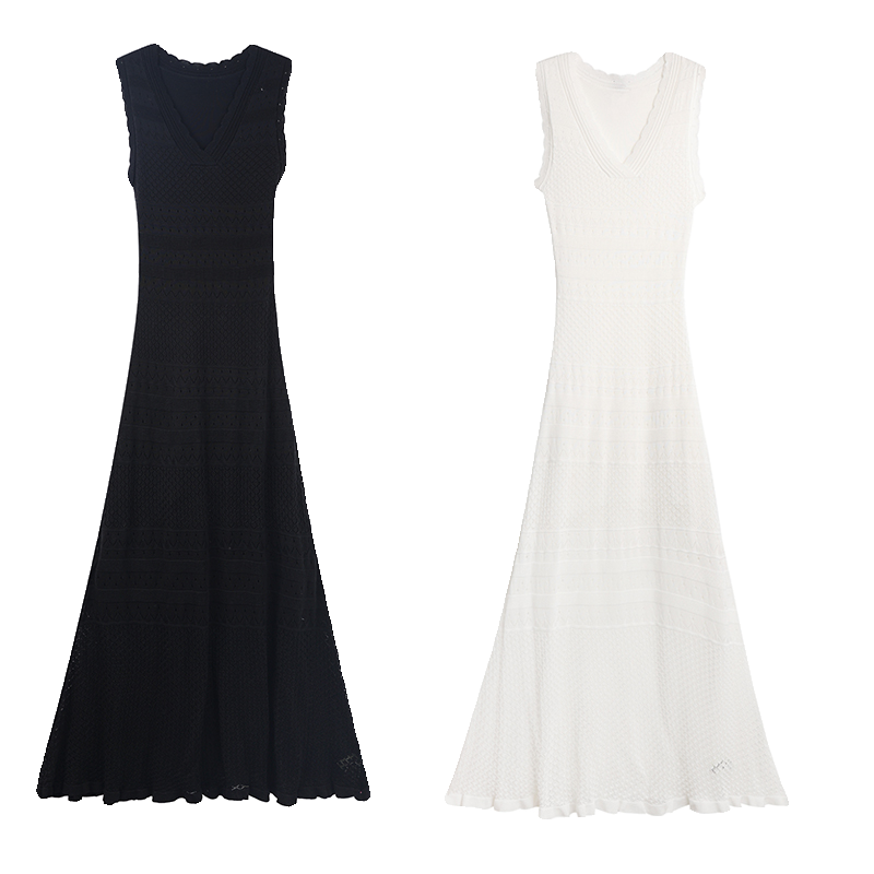 浅布调高个子春夏新高级感v领修身100%天丝针织镂空连衣裙长裙女