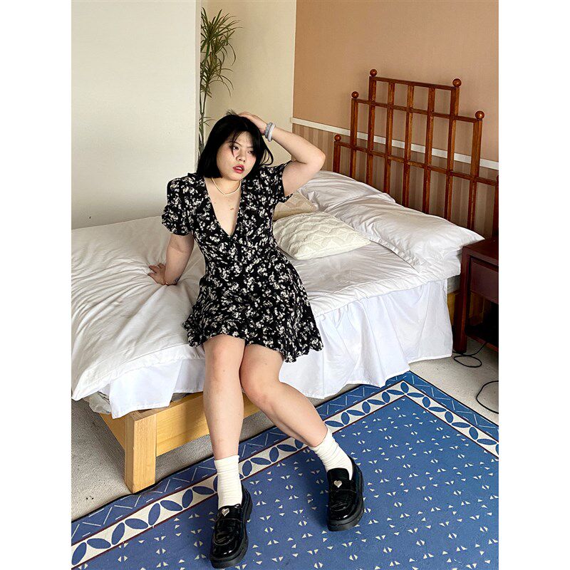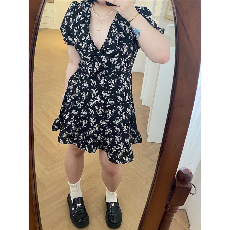 小胖噔 碎花绑带连衣裙女夏季胖mm收腰显瘦度假微胖大码短款裙子