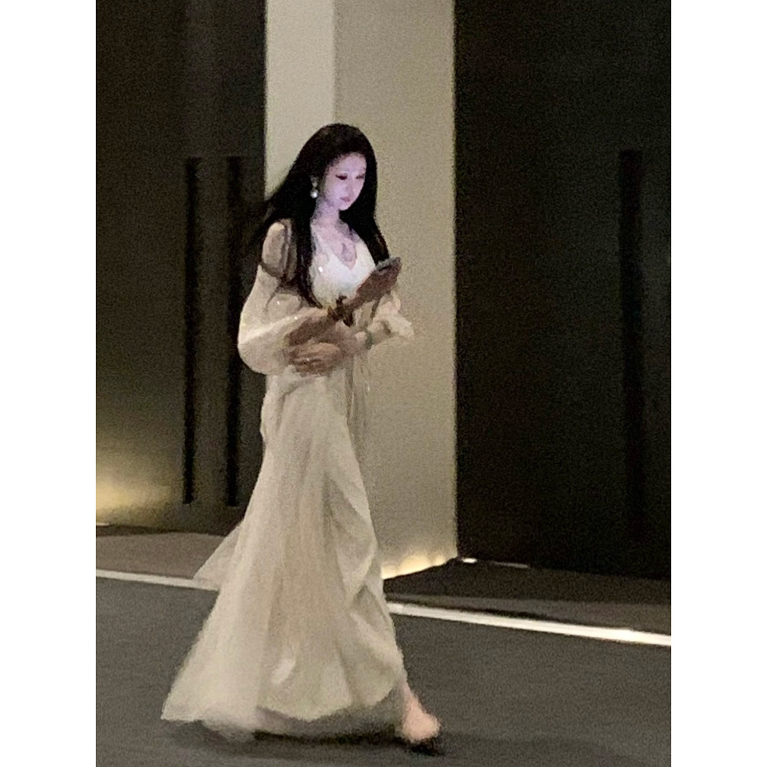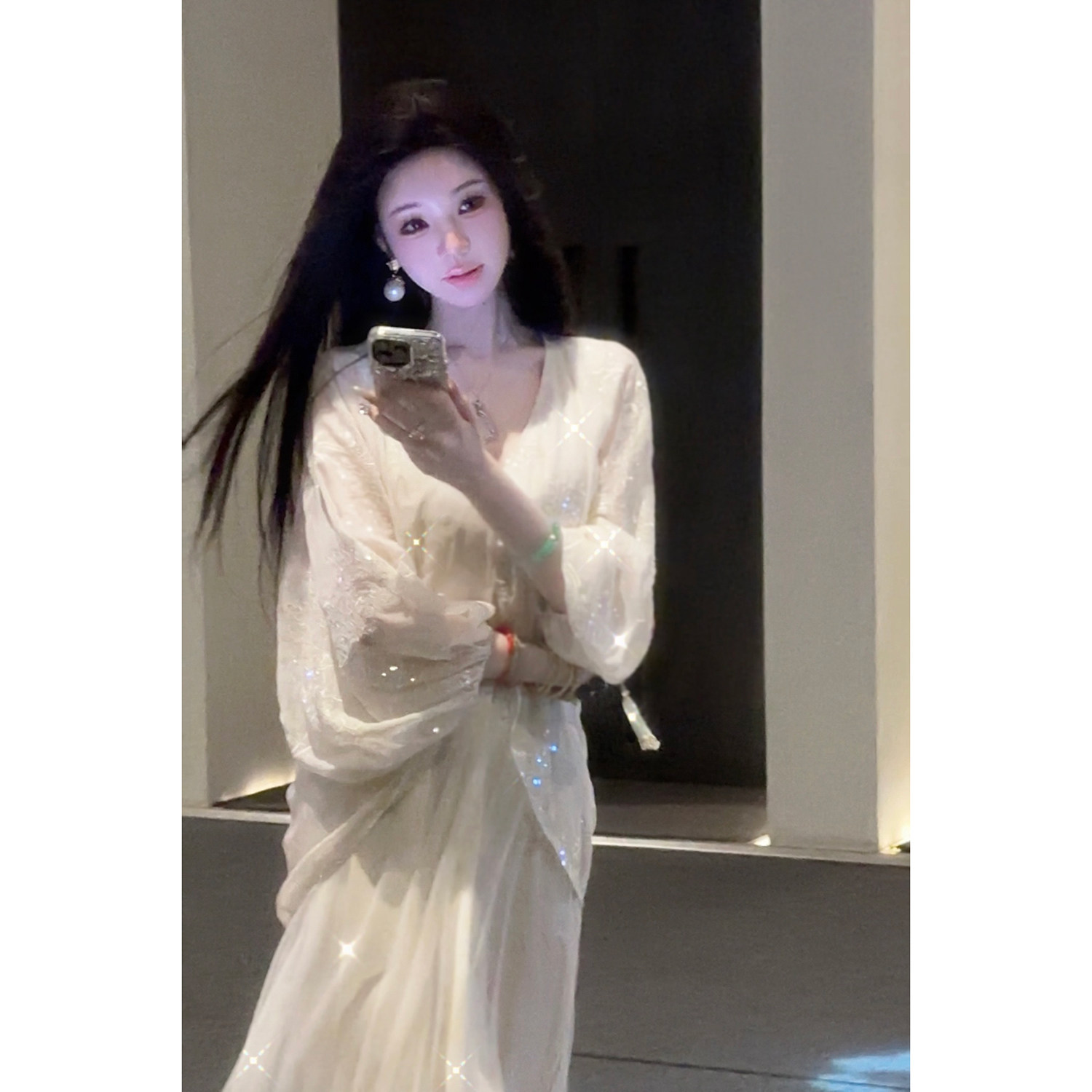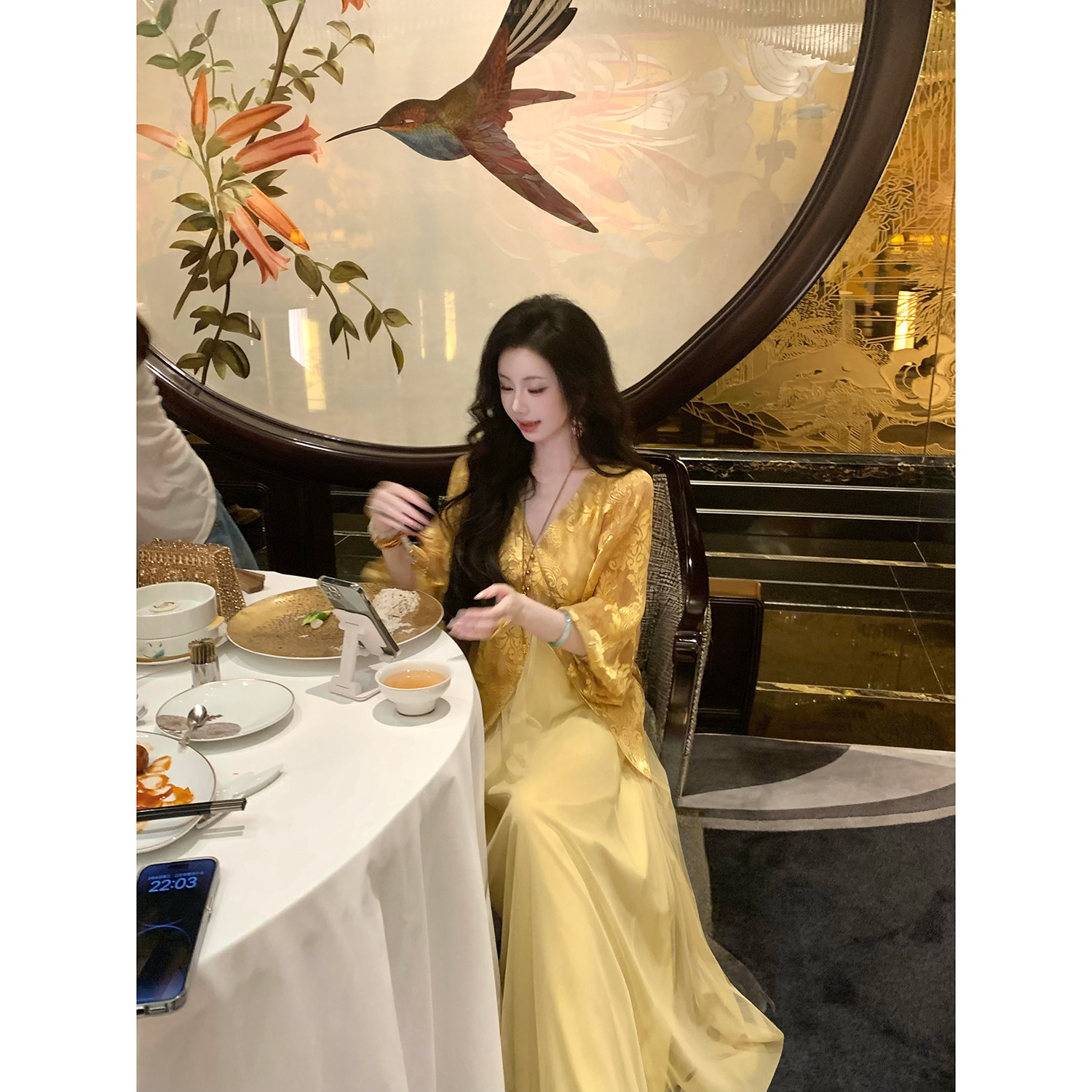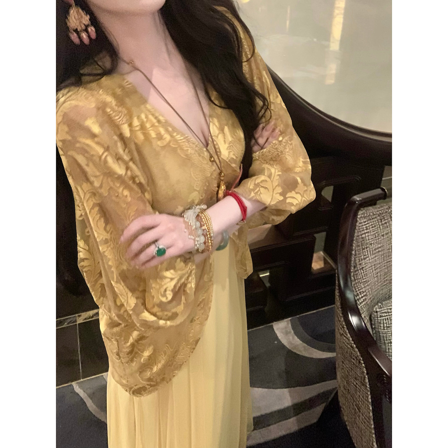Sun雅乔【金玉浮图】春装复古提花宽松蝙蝠袖假两件长袖连衣长裙