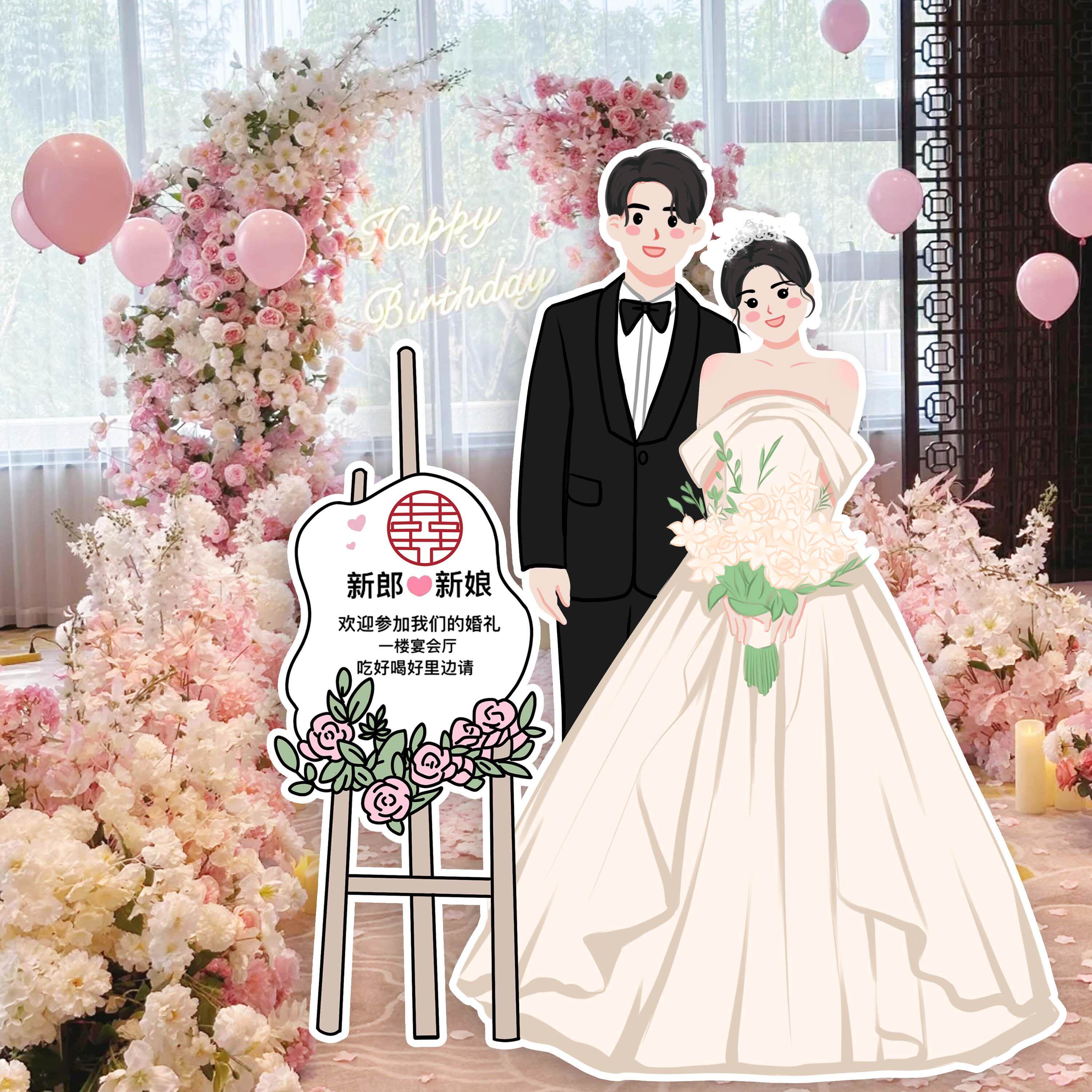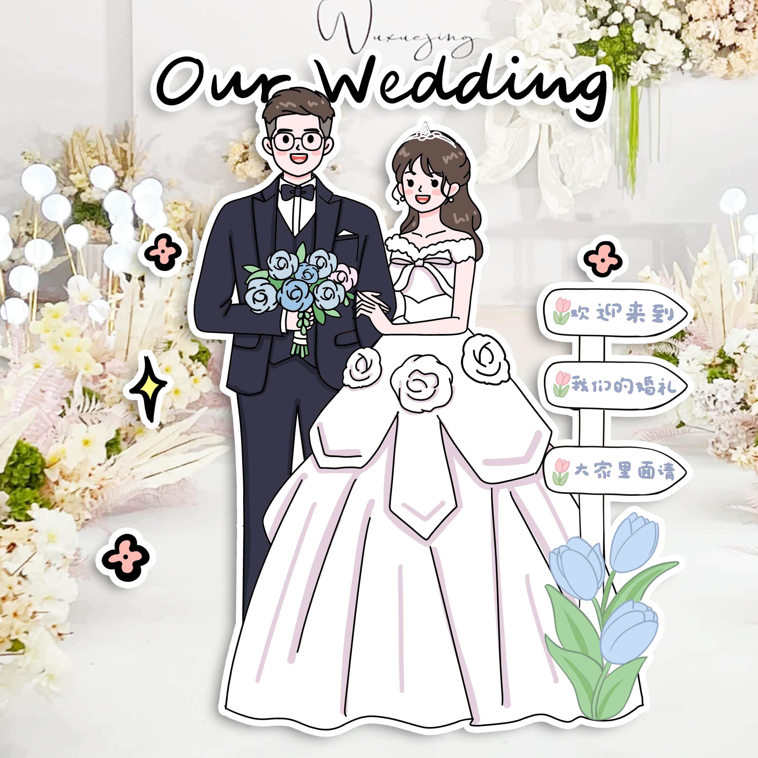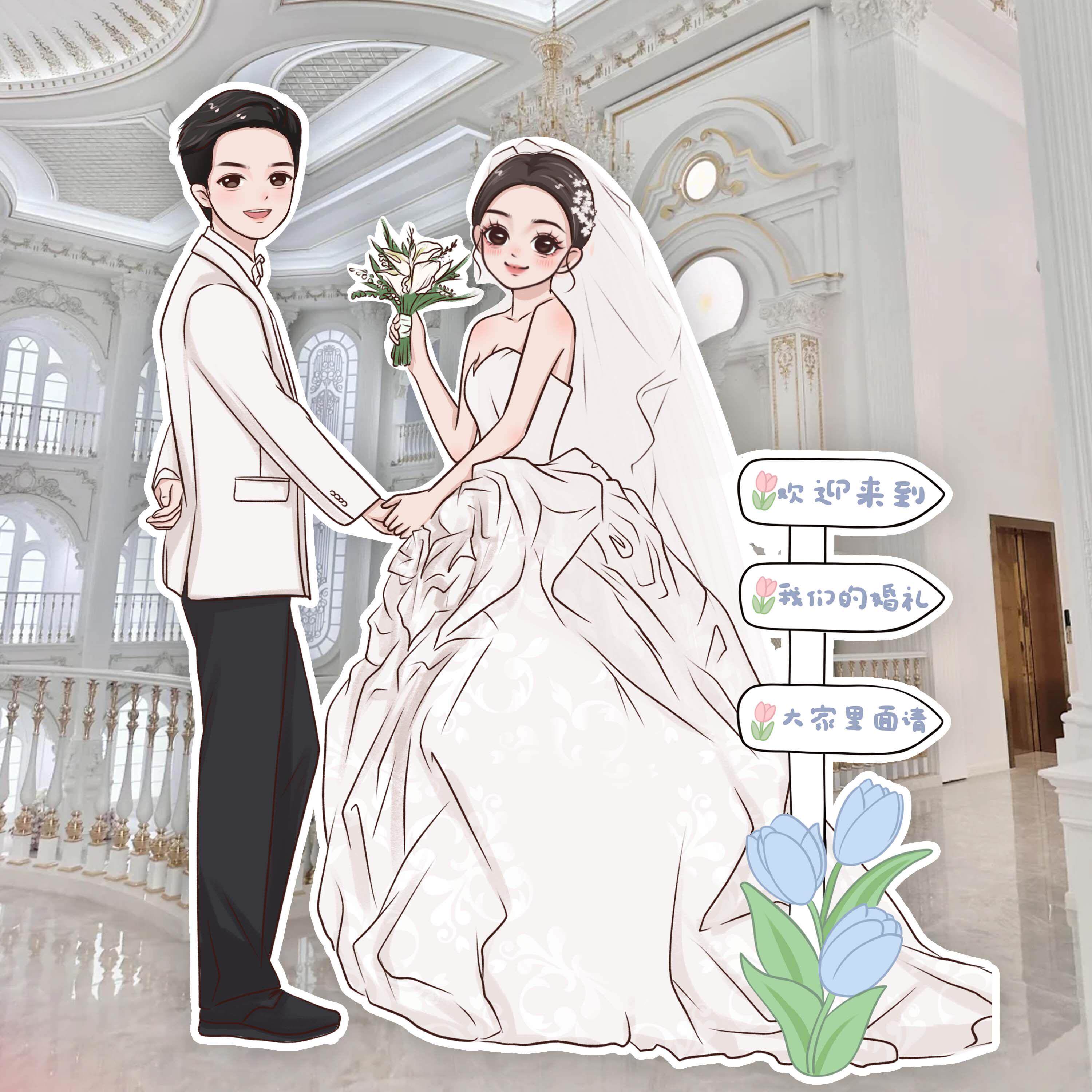 婚礼迎宾手绘卡通人形立牌kt板定制西式婚礼素材订婚宴海报指示牌