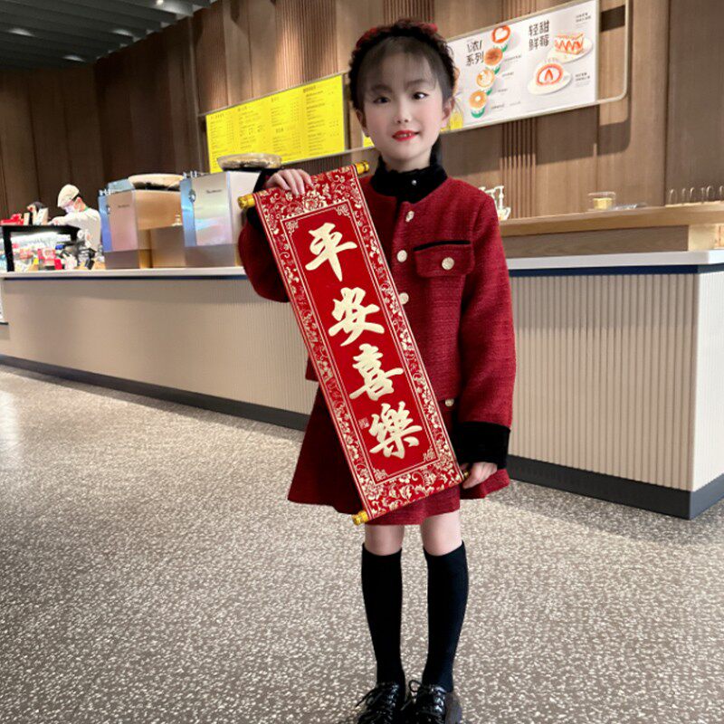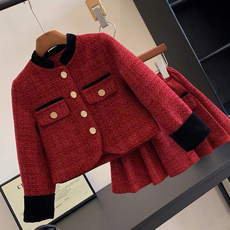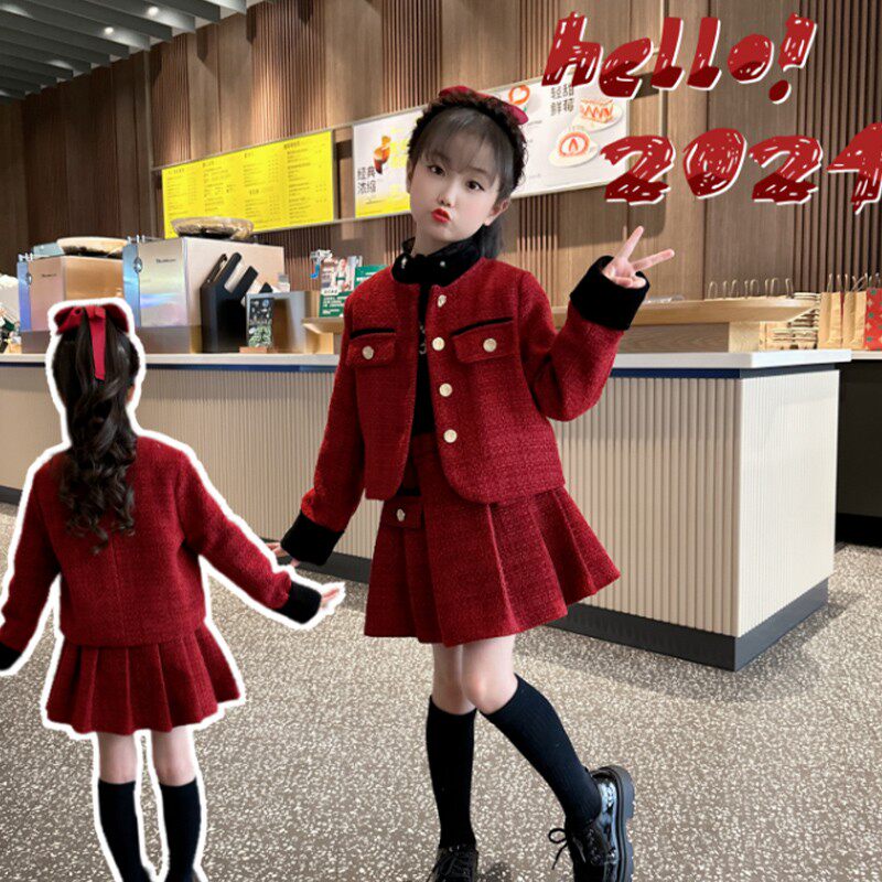 女童小香风套装秋冬2026新款儿童女孩过年红色裙子新年衣服两件套