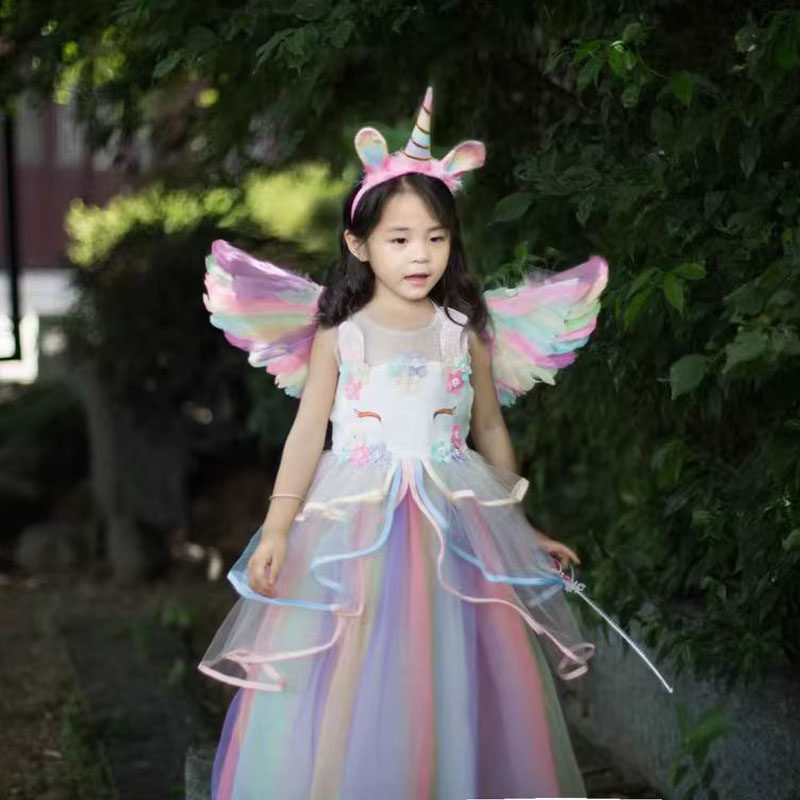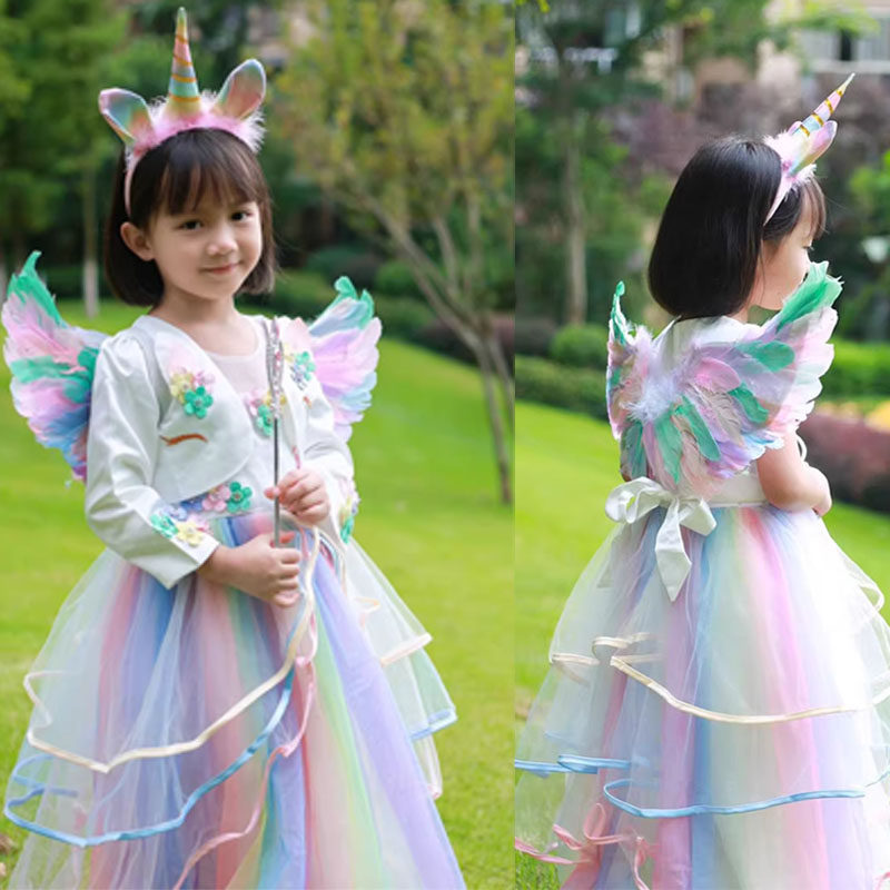万圣节公主裙女童cos服独角兽生日礼服彩虹蓬蓬裙长纱裙子秋冬夏