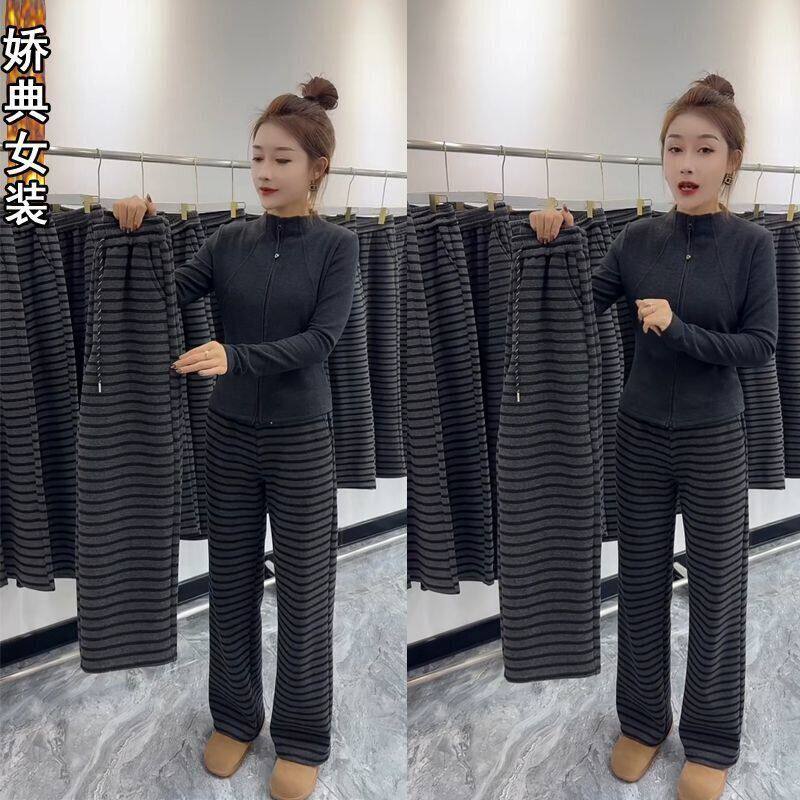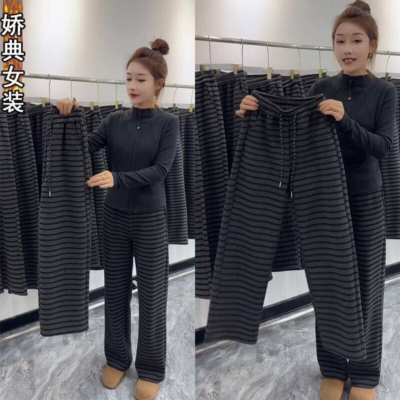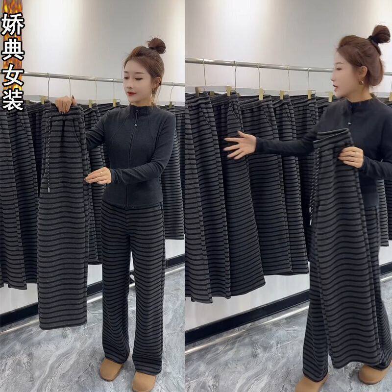 仔版加绒条纹加厚阔腿高腰宽松新款运动直筒时尚休闲裤子显个子女
