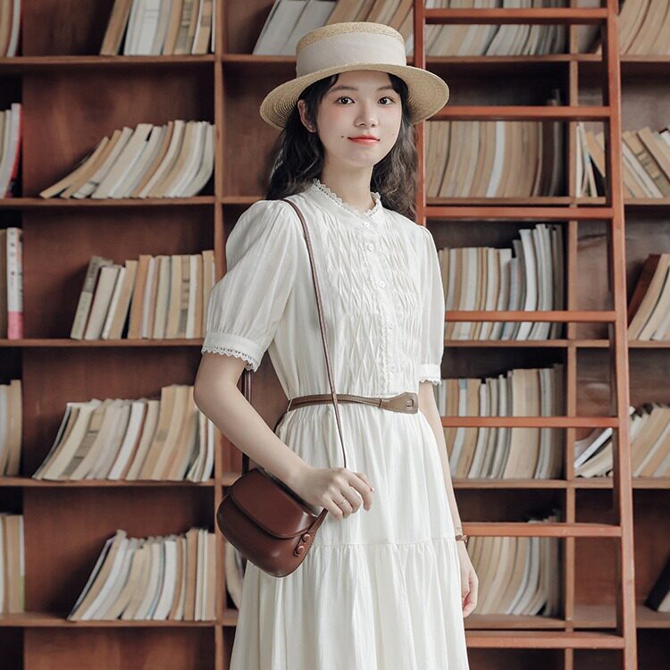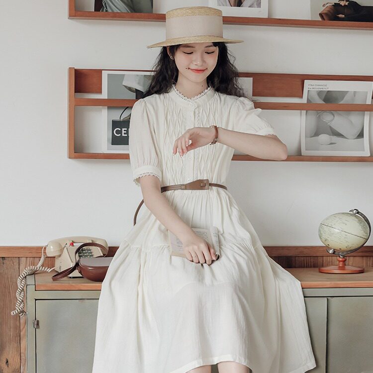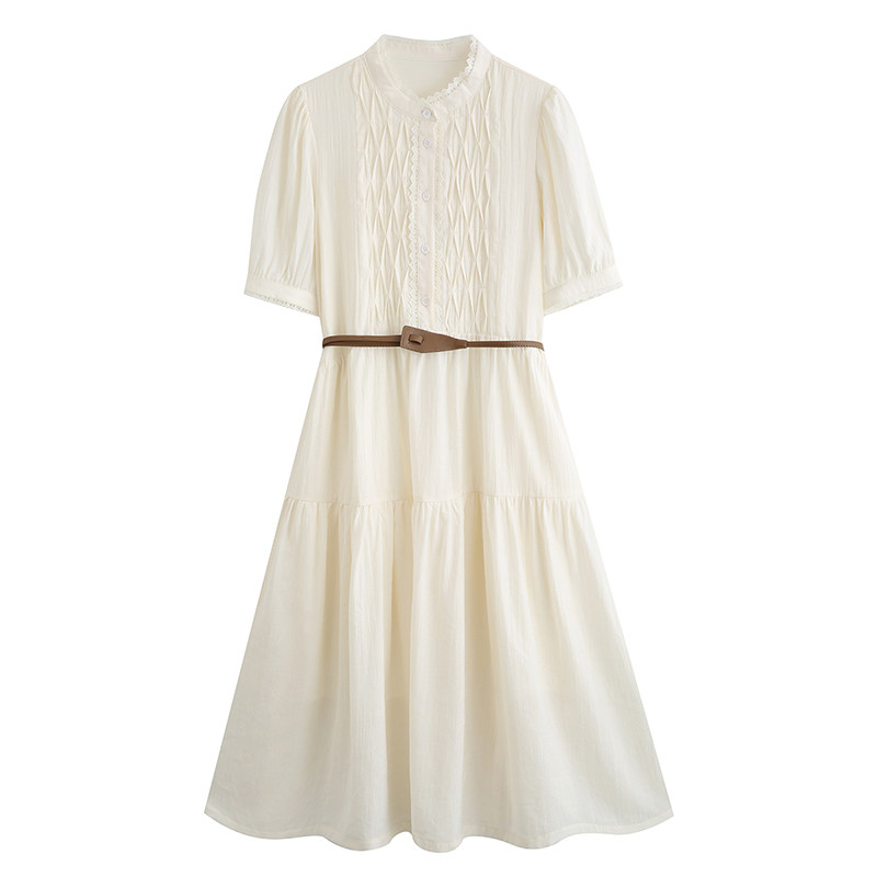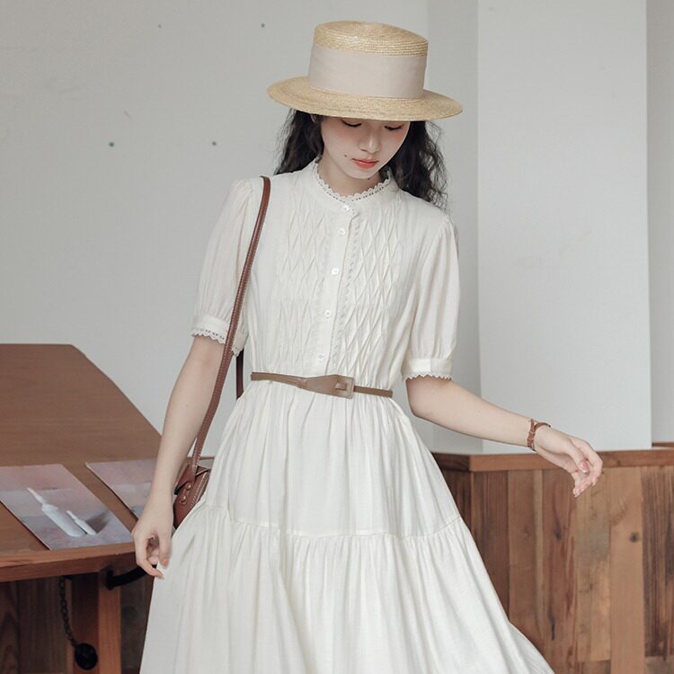 茶歇法式米白色连衣裙女2023夏季新款a字收腰显瘦长裙小个子