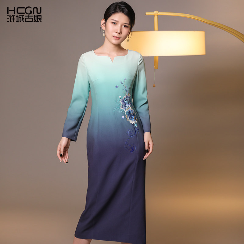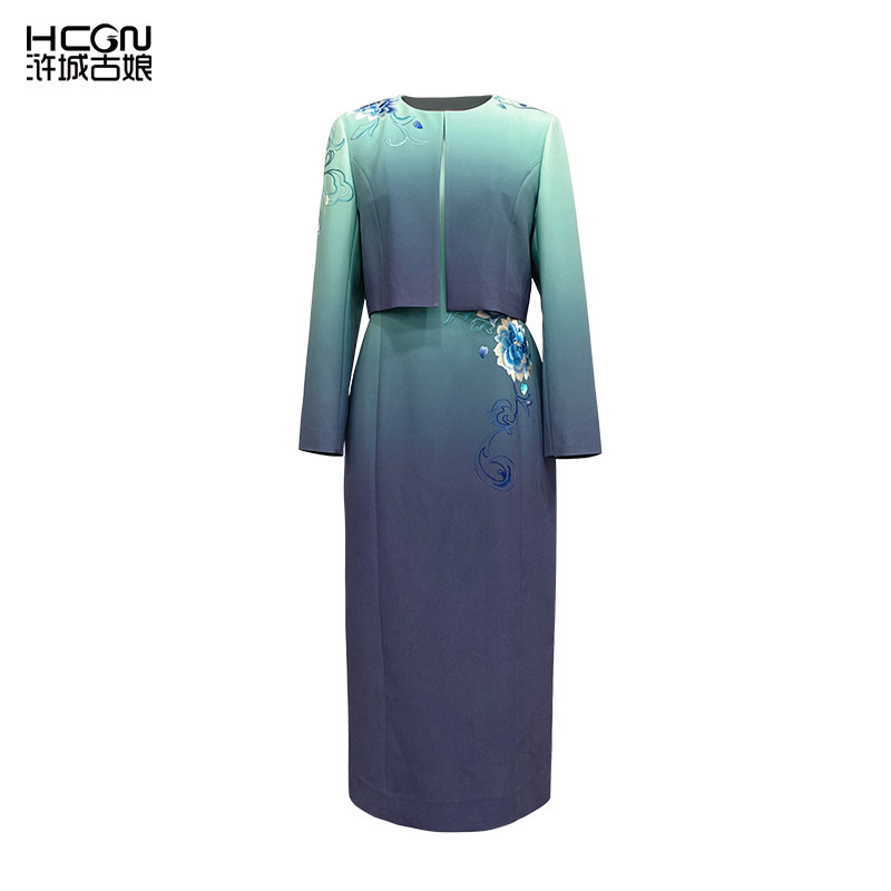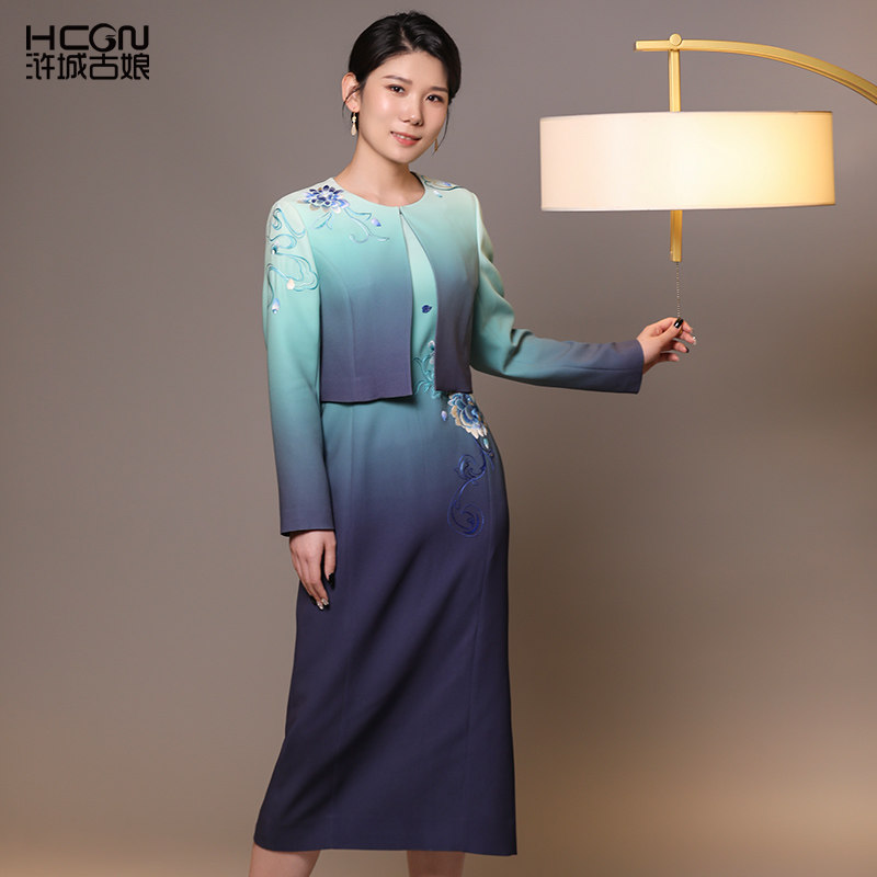 醋酸中式渐变精致刺绣外套连衣裙气质舒适修身显瘦长袖圆领女套装
