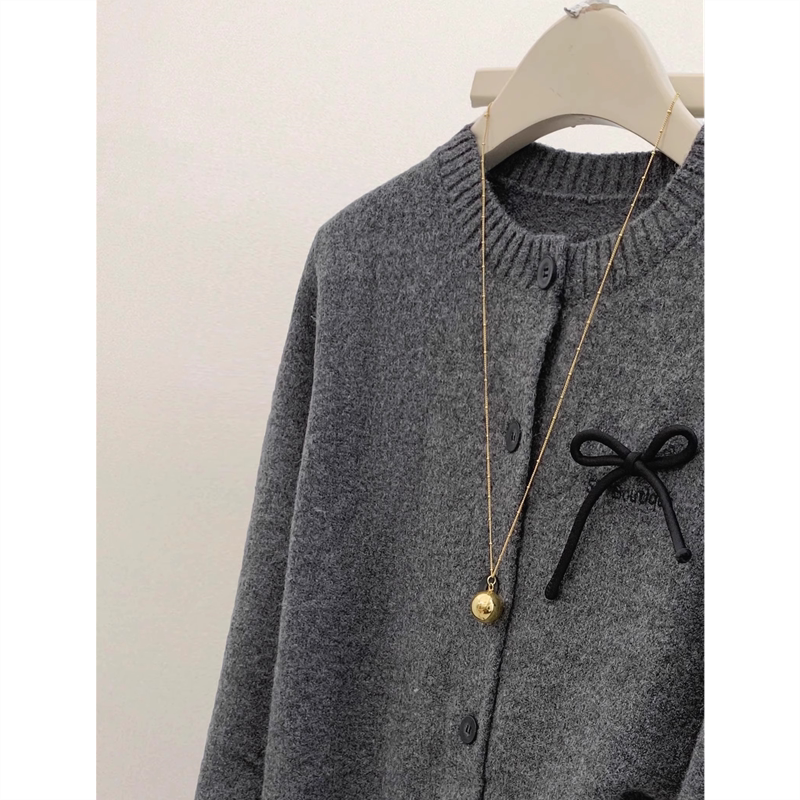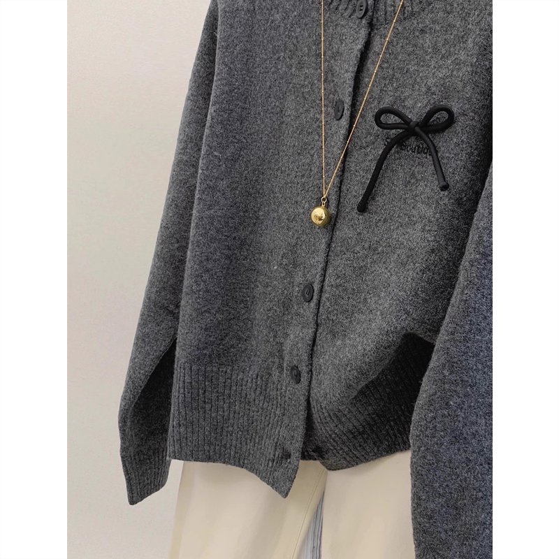 灰色蝴蝶结针织毛衣开衫女春秋秋冬大码内搭针织衫外套加厚上衣