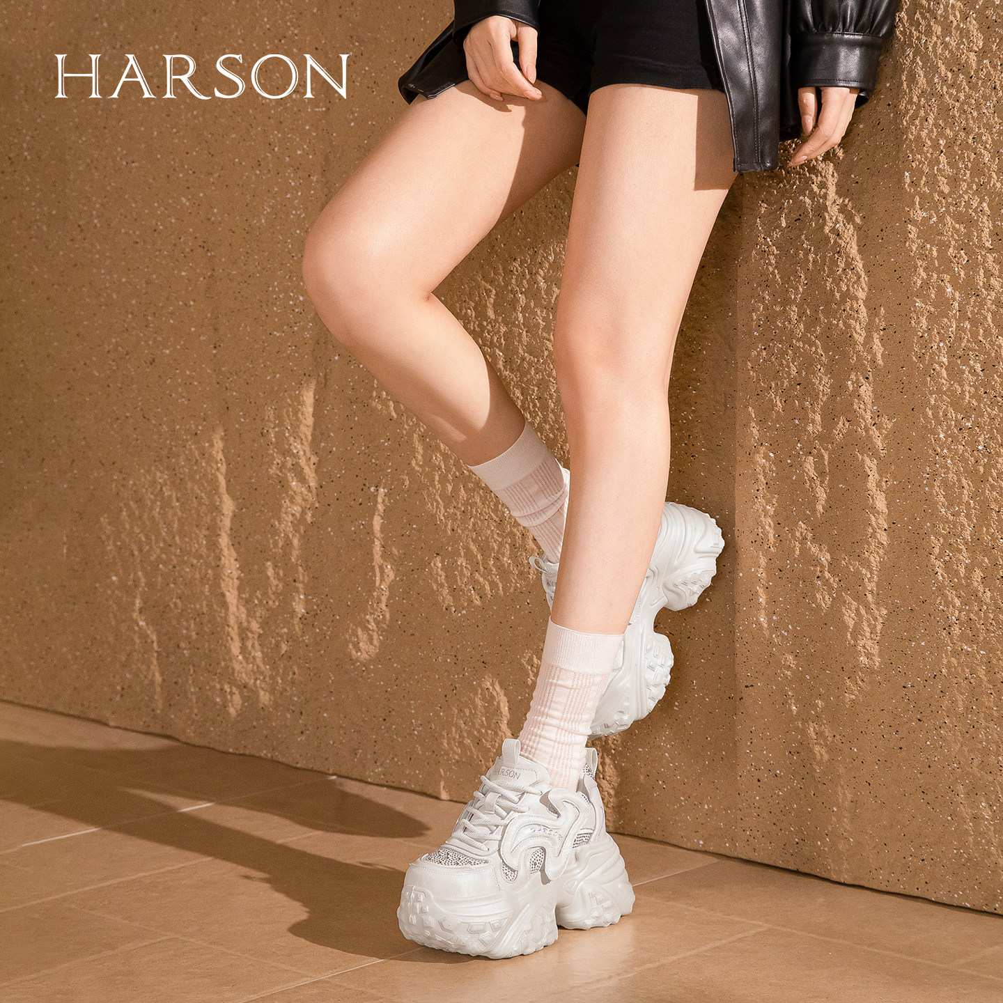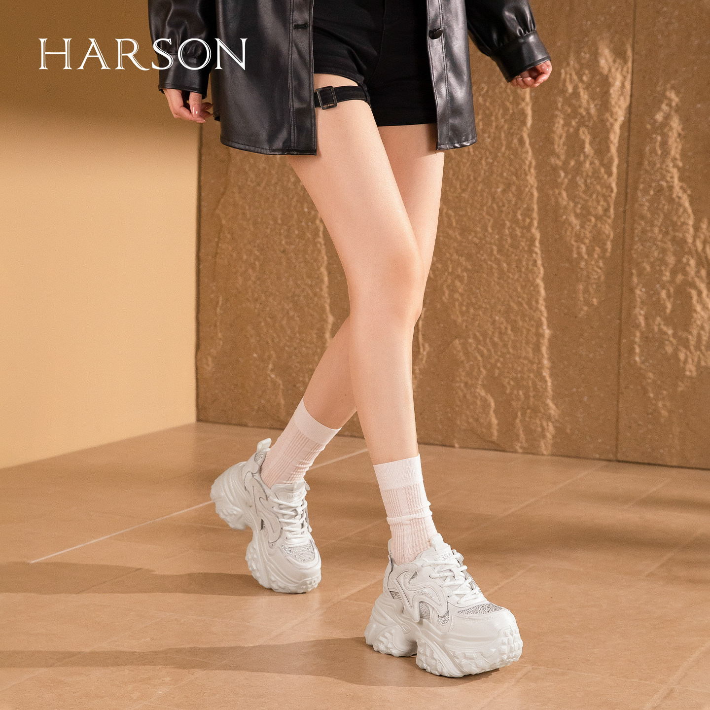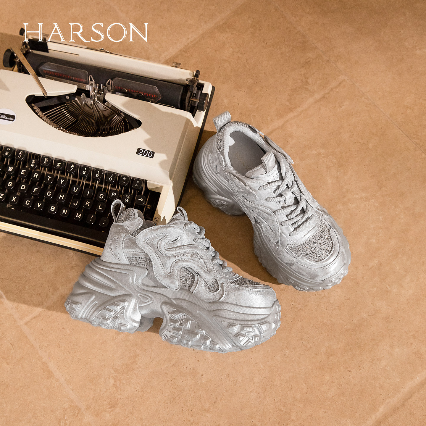 哈森水钻厚底老爹鞋女增高百搭时尚摩登休闲鞋2026新款HWCS260112
