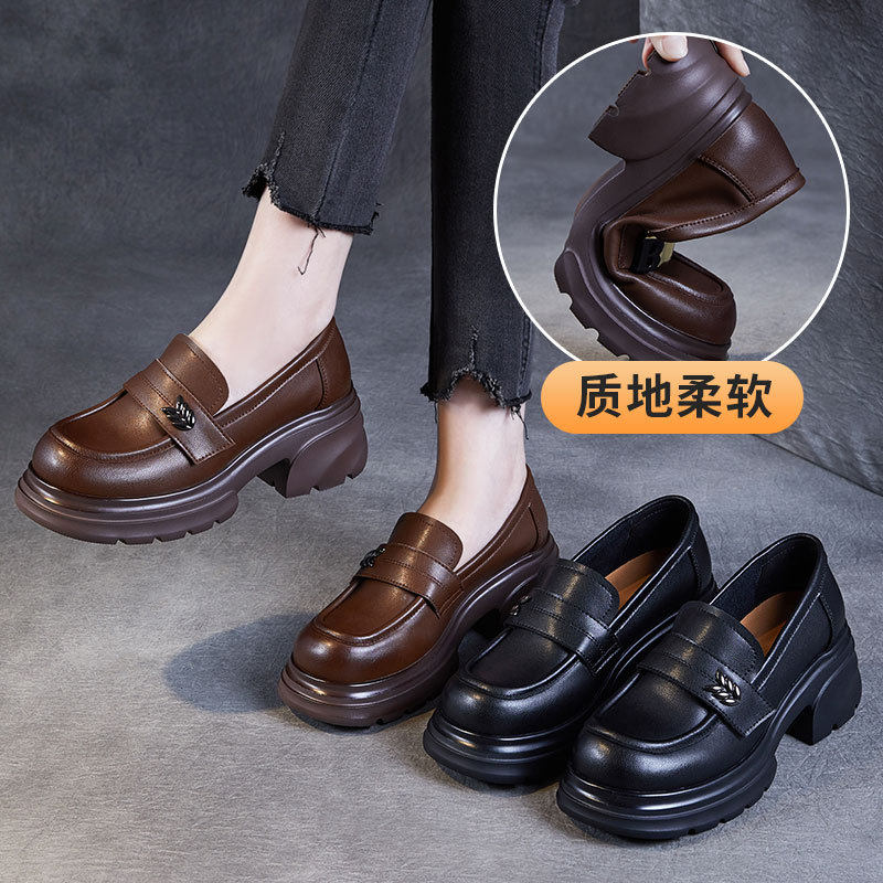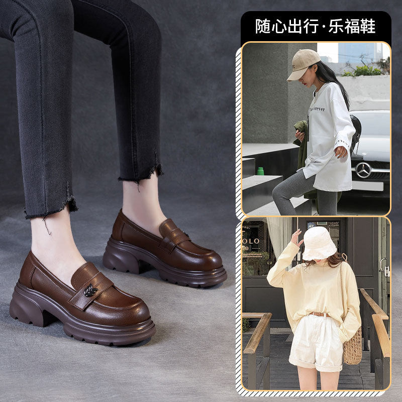 今年流行特惠百搭英伦厚底乐福鞋真皮增高纯色一脚蹬小皮鞋魔术贴