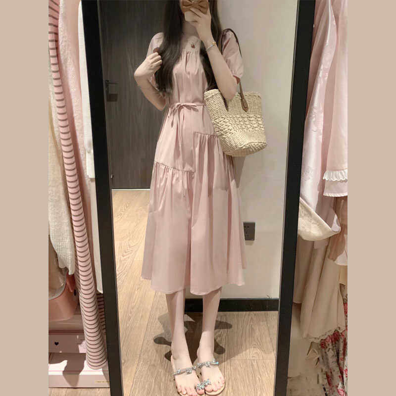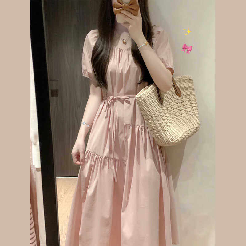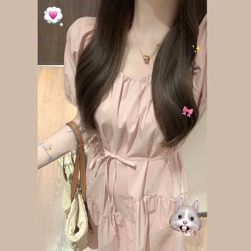 粉色系带收腰显瘦连衣裙女夏季新款泡泡袖宽松甜美小个子a字长裙