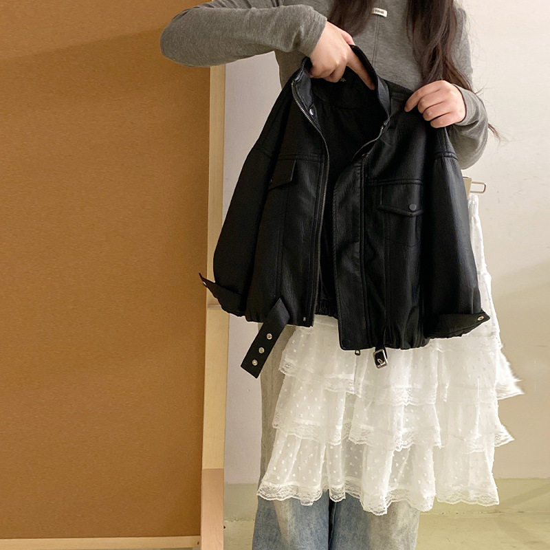 2026春装新款女童韩版不规则短袖T时尚皮衣外套蕾丝蛋糕半身裙