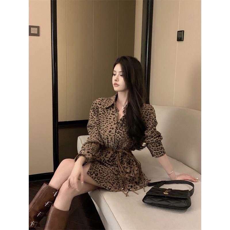 BRAONMA 轻奢气质~法式豹纹高级感收腰包臀长袖V领连衣裙女秋冬季