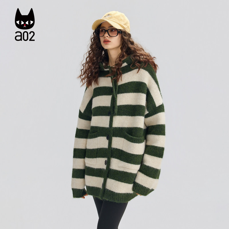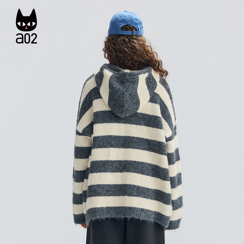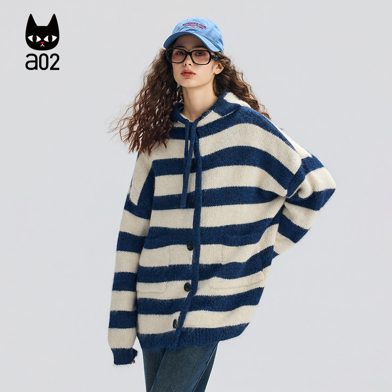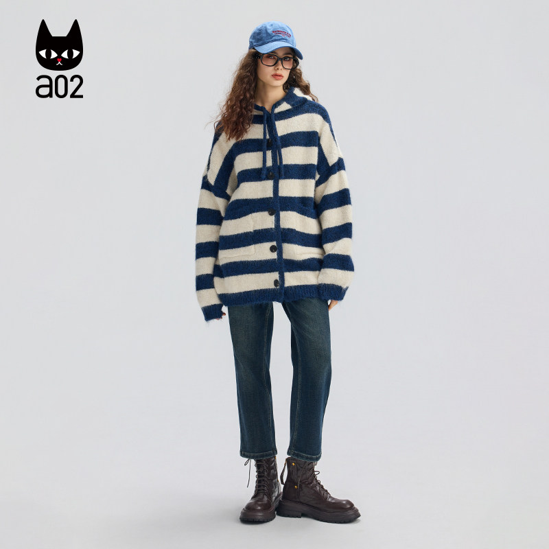 a02宽松条纹连帽针织衫女2025新款冬季加厚保暖开衫外套冬装毛衣
