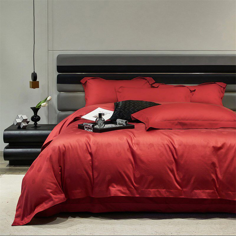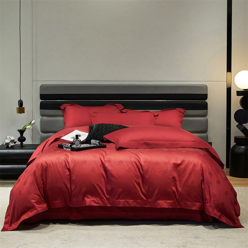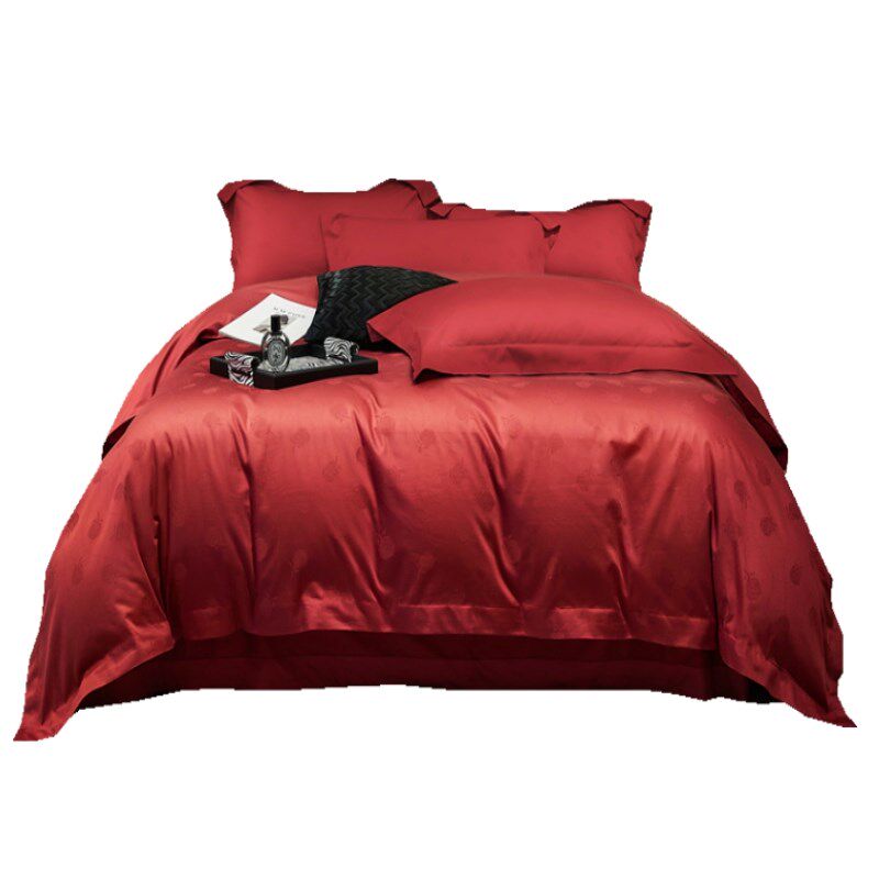 高端180d支全棉提花四件套匹马棉纯棉被套纯色酒红色结婚床上用品