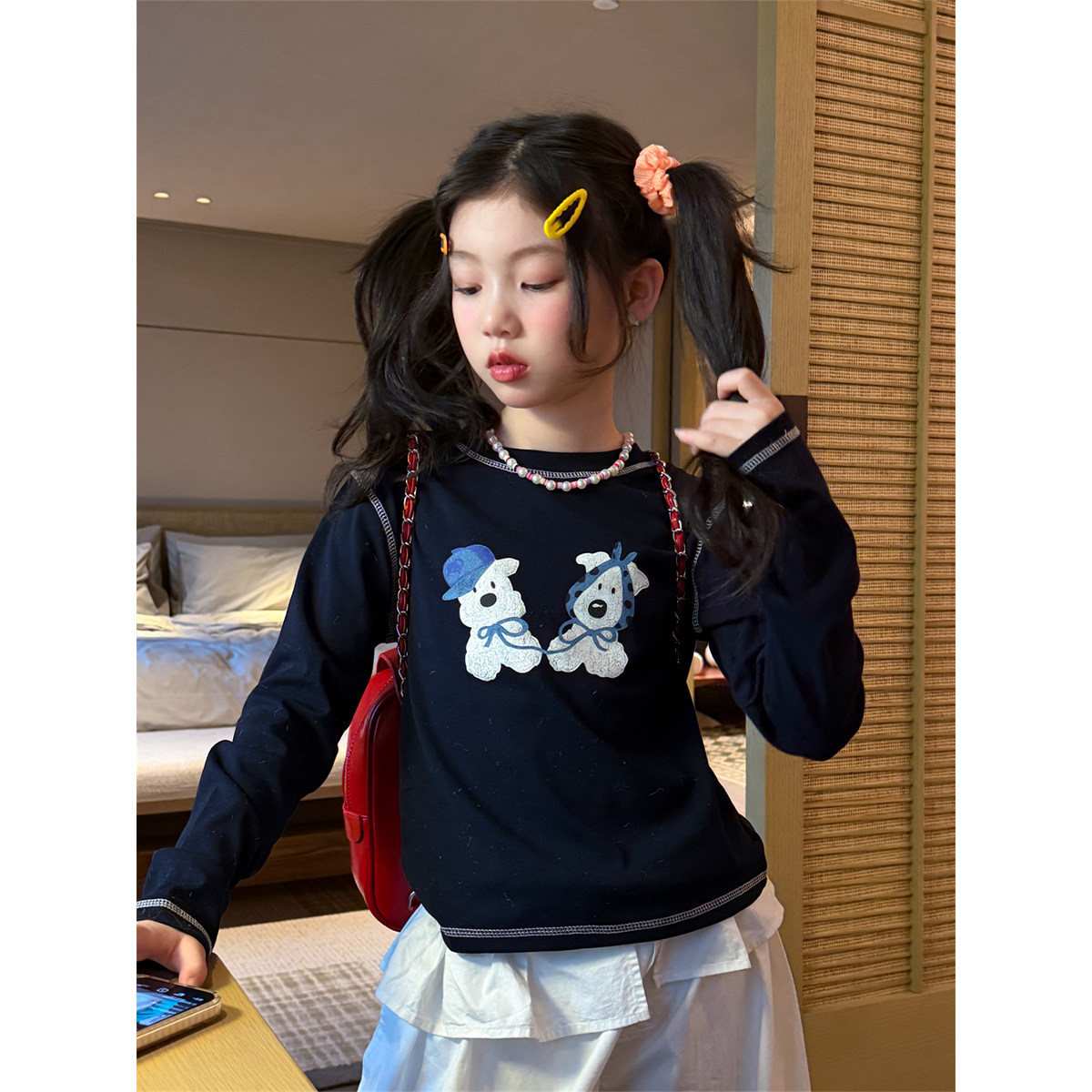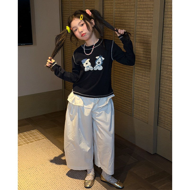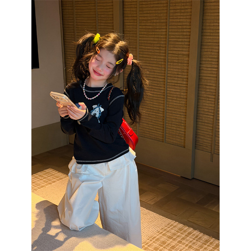女童甜美卡通小狗圆领长袖T恤2026春装黑色打底衫可爱休闲上衣