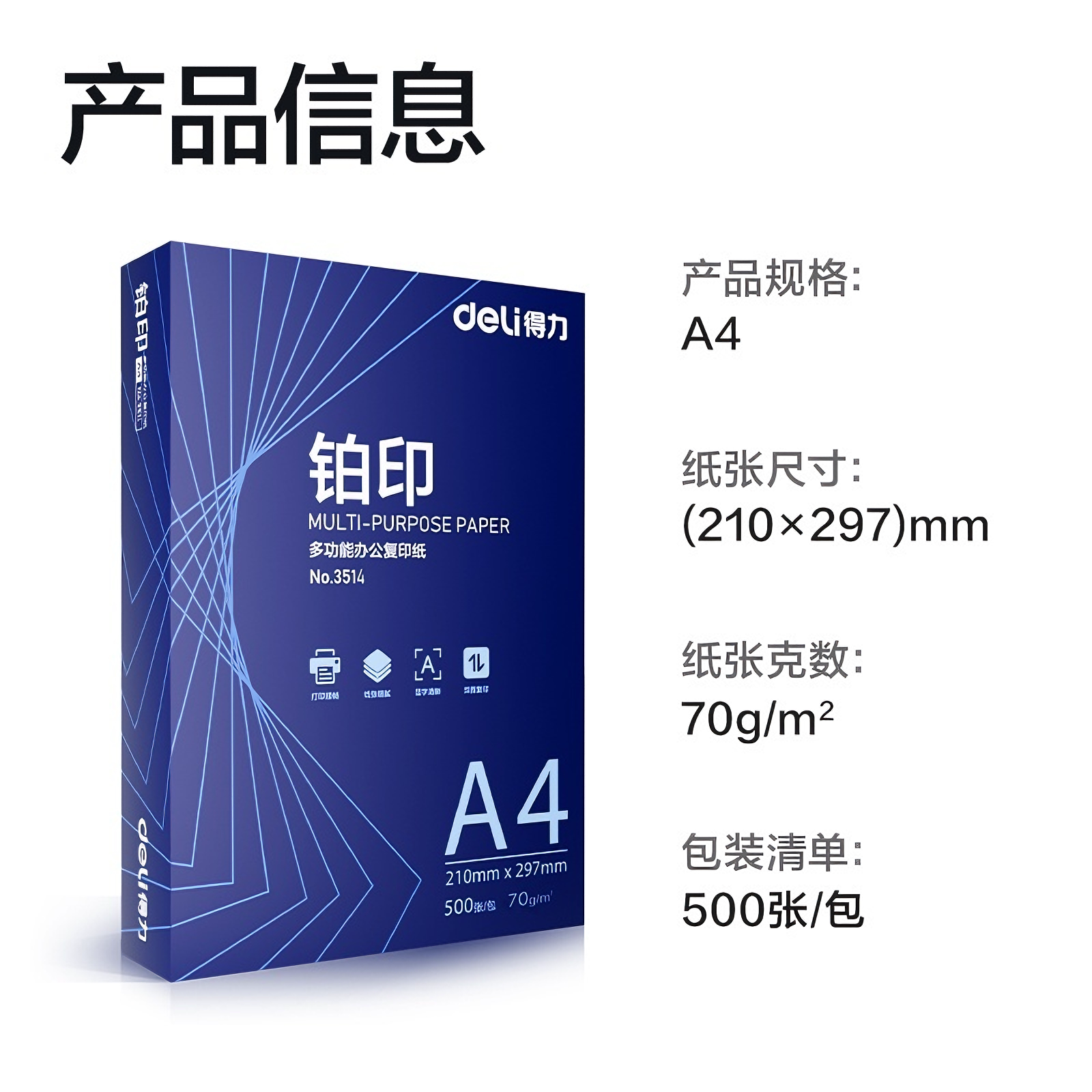 得力铂印A4打印纸A3/A5/B4/B5/8K/16K原木浆双面草稿纸试卷打印纸
