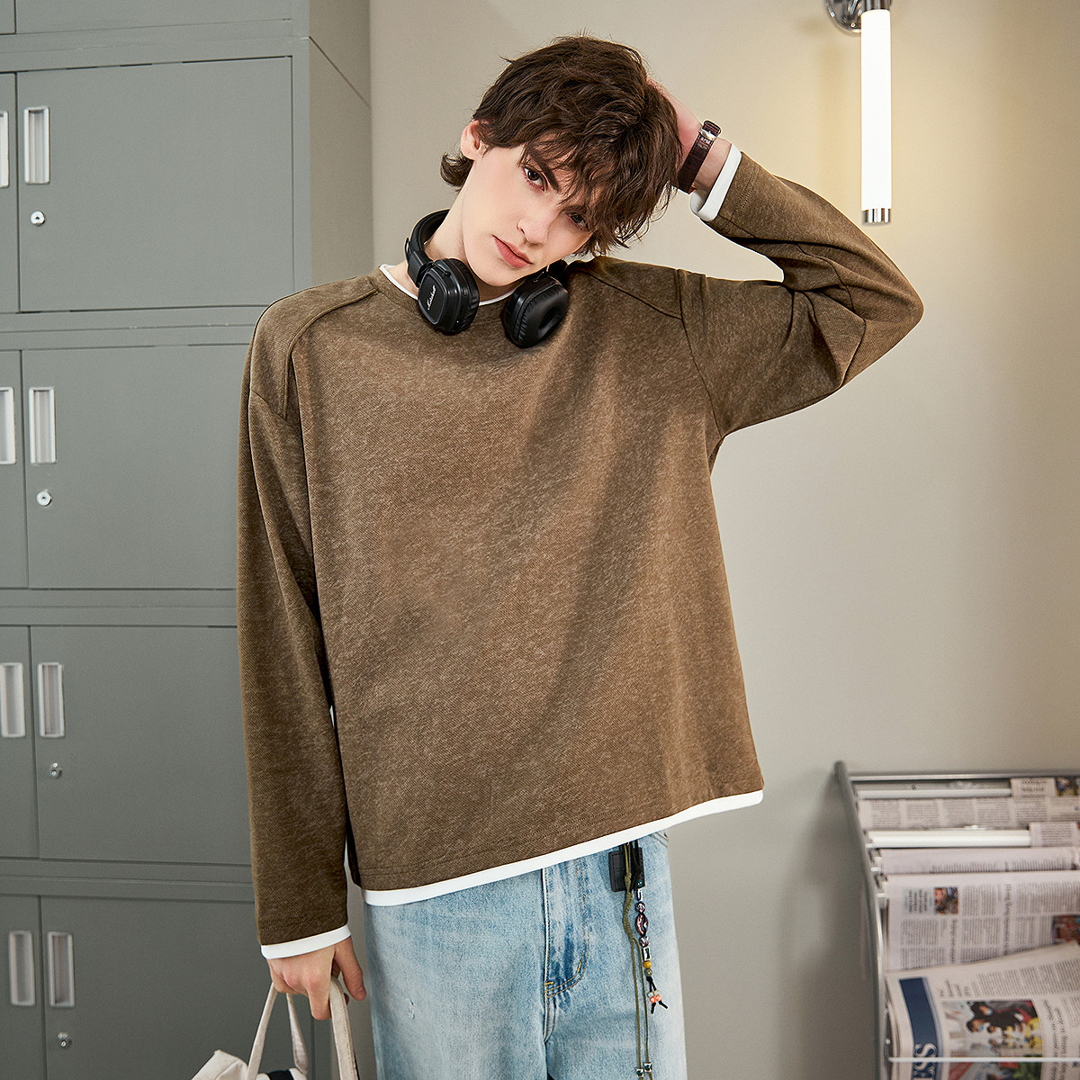唐狮2026春秋男士圆领长袖T恤男款基础净色假两件休闲宽松慵懒风