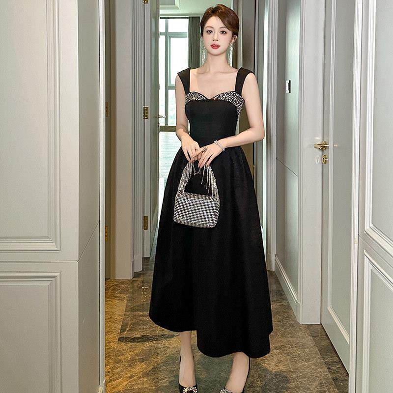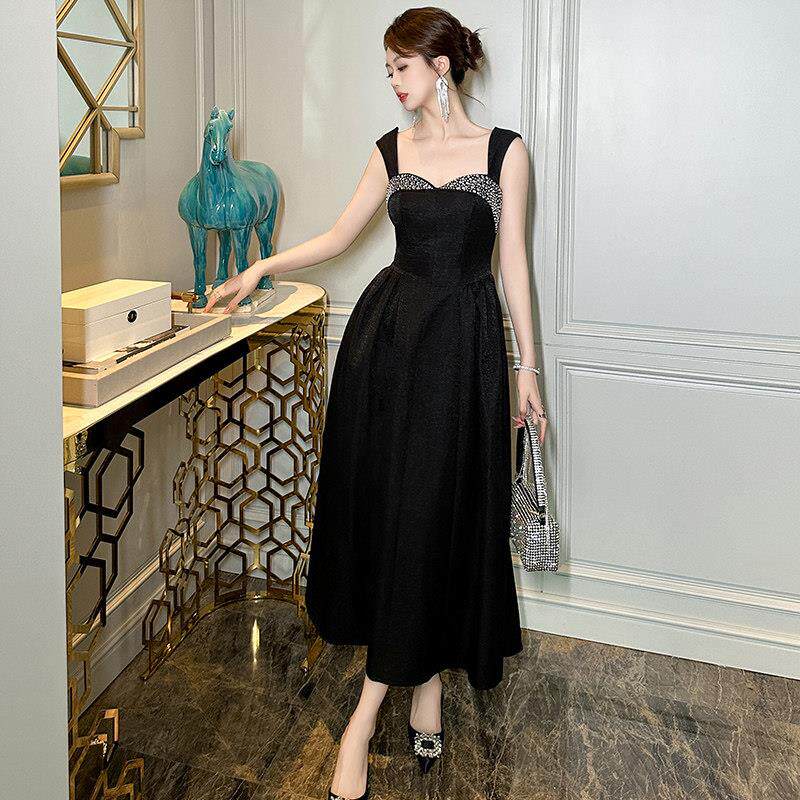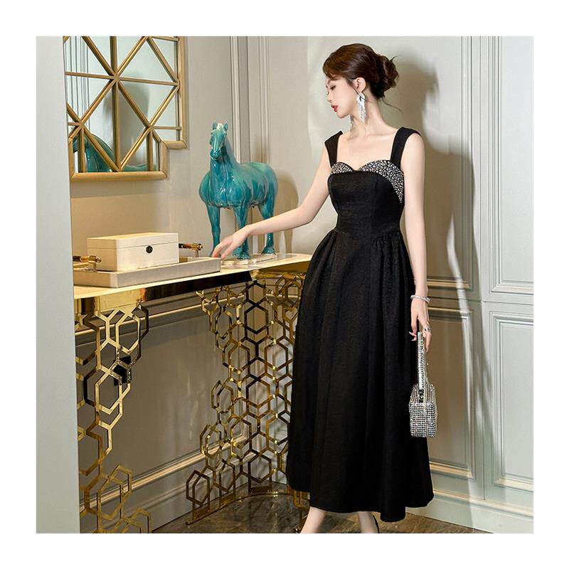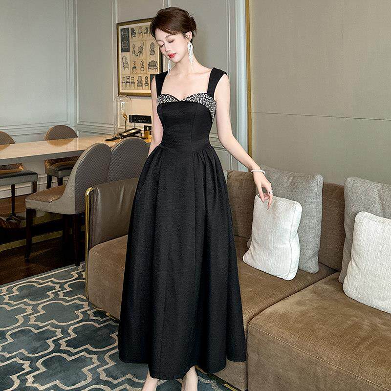 法式连衣裙女夏高级感轻奢小众烫钻收腰显瘦黑色无袖吊带a字长裙