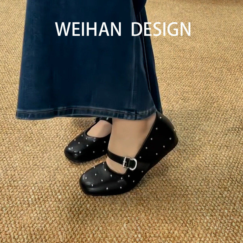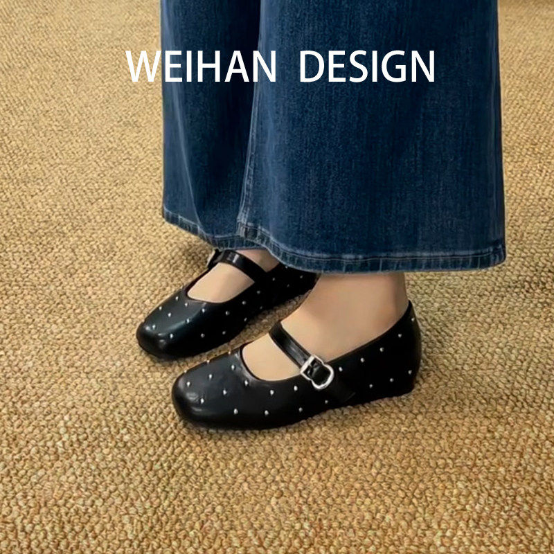 羊皮版!复古满天星铆钉单鞋女内增高小皮鞋春款一字扣带玛丽珍鞋