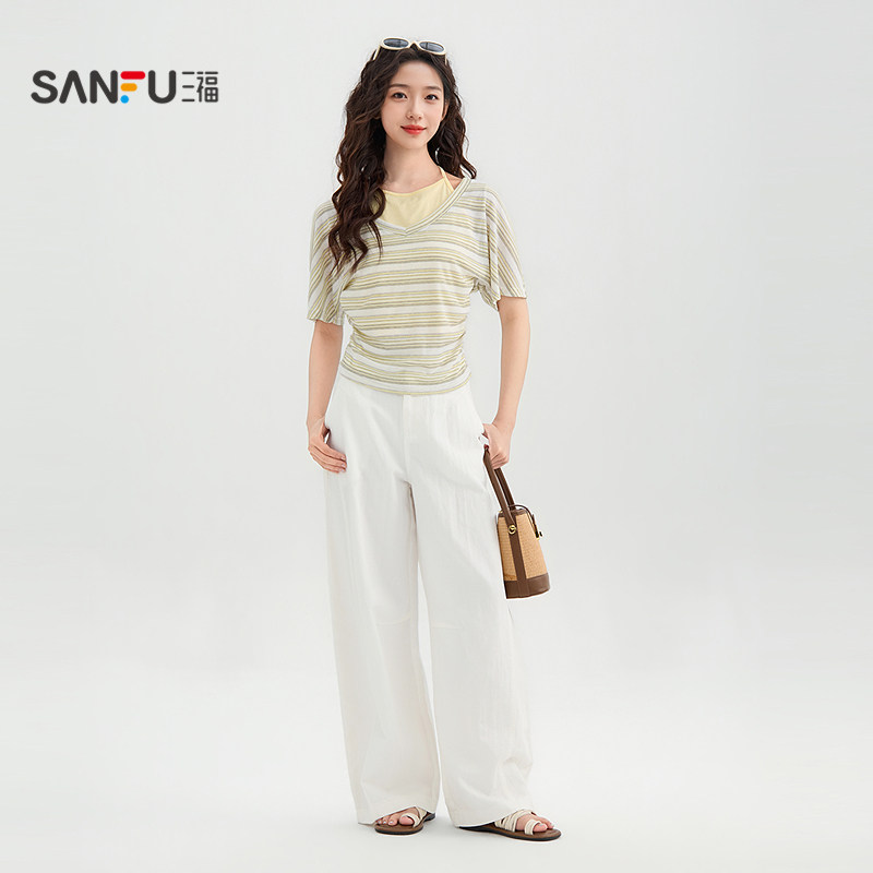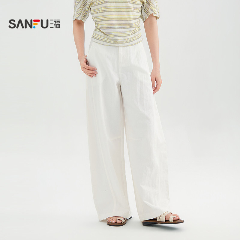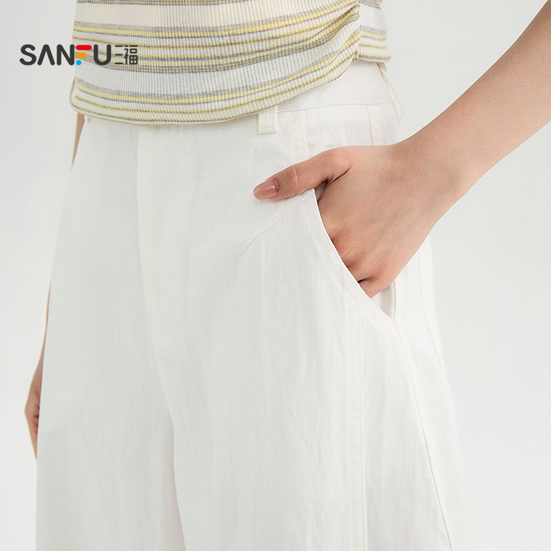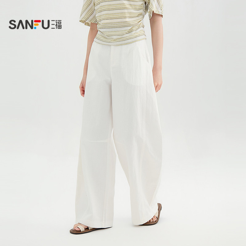 三福白色裤子2026新款夏季简约宽松弯刀裤直筒休闲长裤女装521362