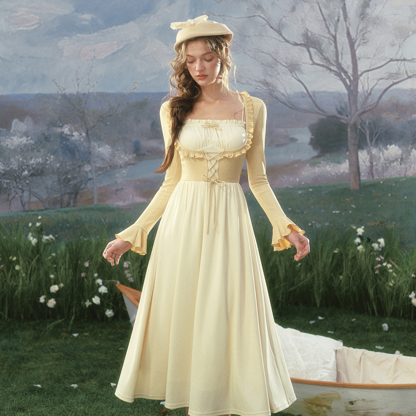 LaceMade 俏黄油 法式甜美设计感撞色假两件长袖连衣裙早春通勤女