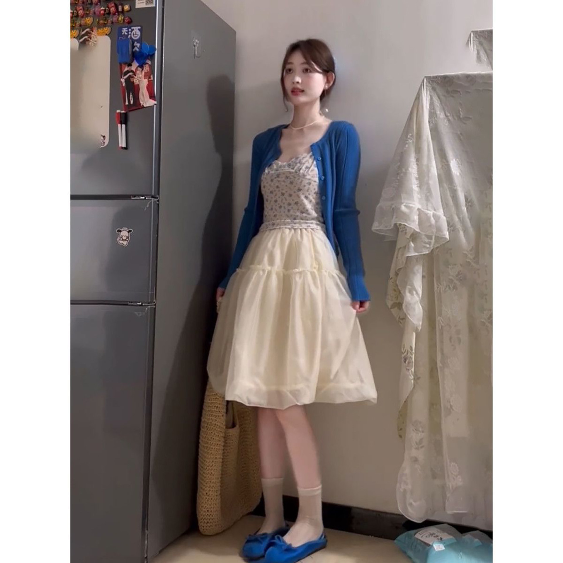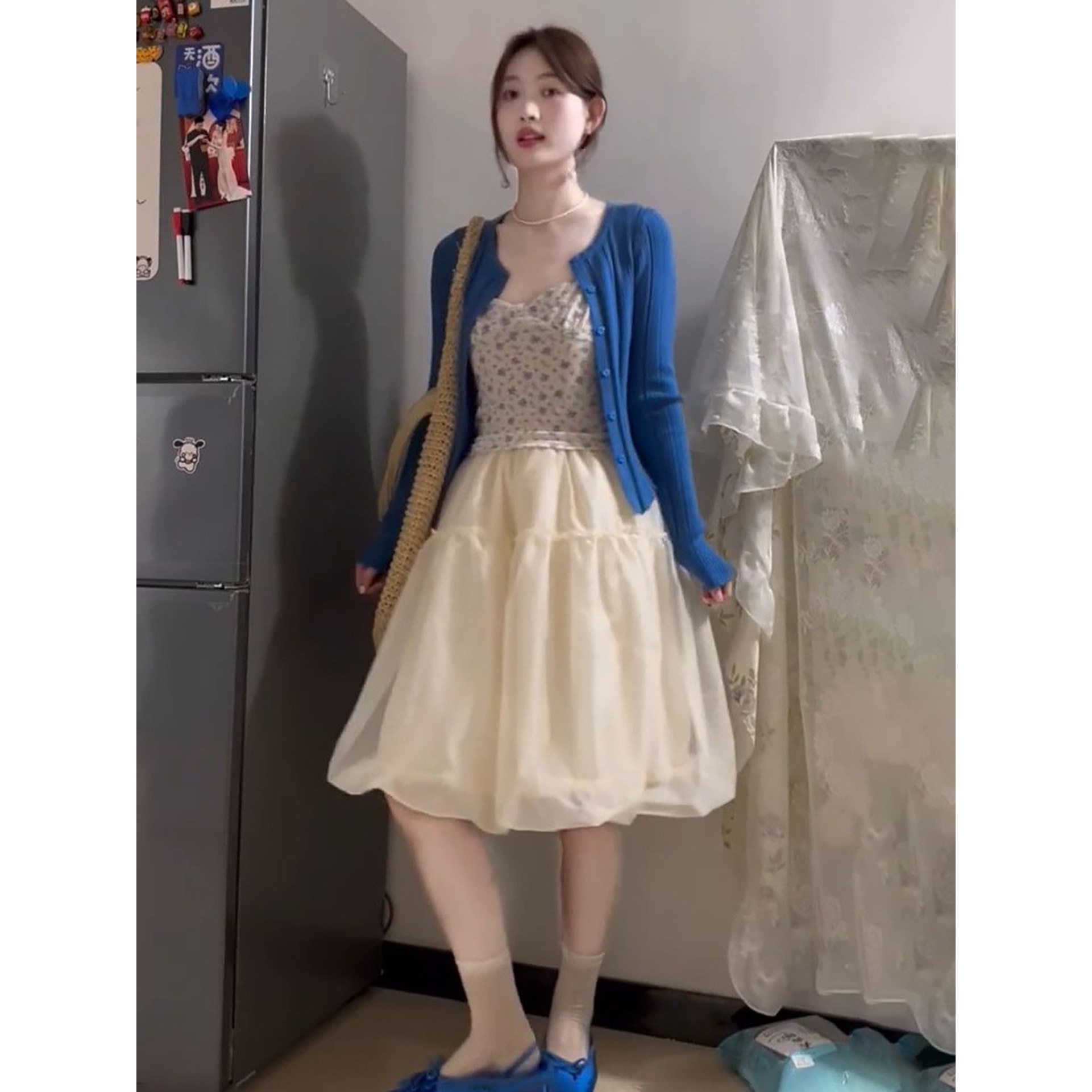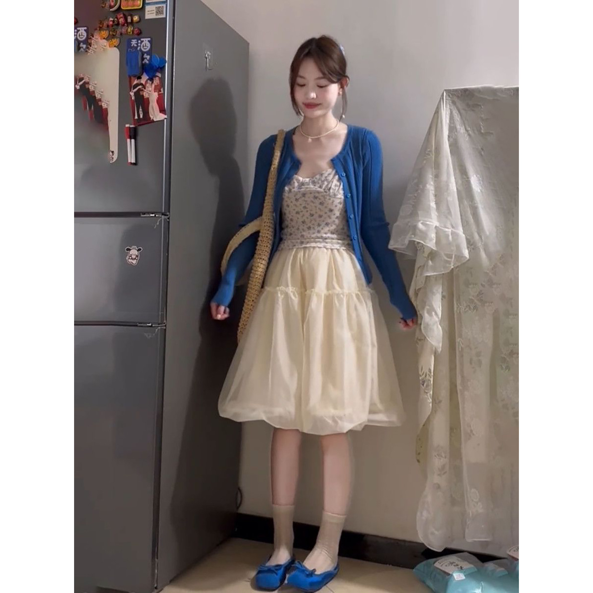夏日气质清纯少女穿搭蓝色针织开衫+碎花吊带+花苞半身裙三件套装