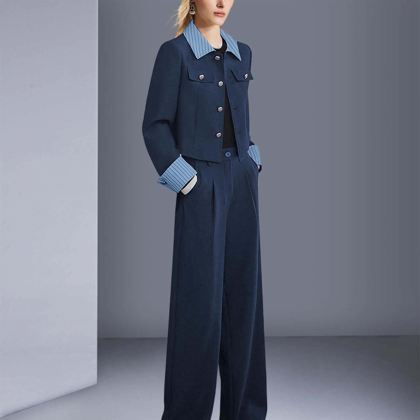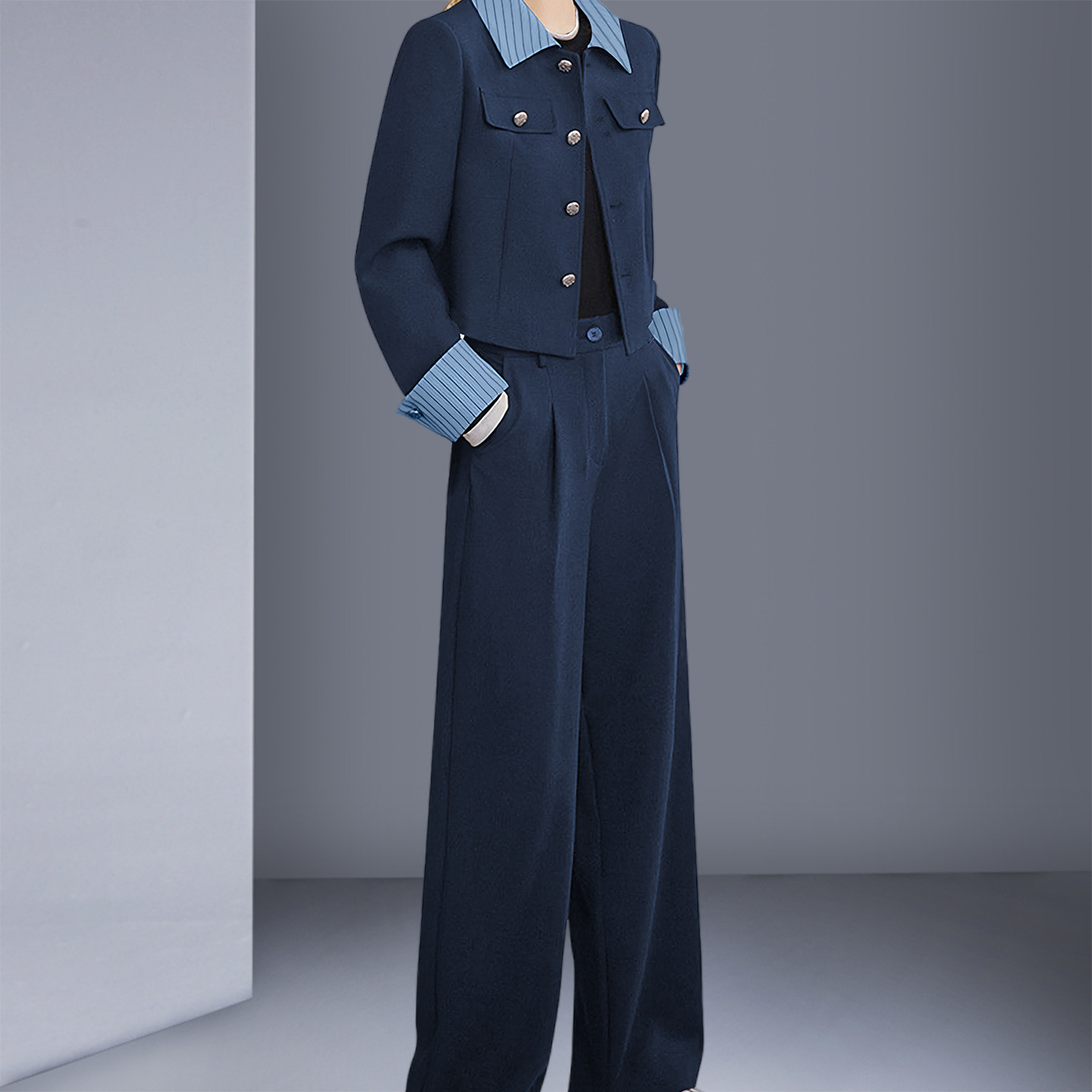 2026春季新款法式复古名媛气质漂亮小翻领拼色短外套显瘦长裤套装
