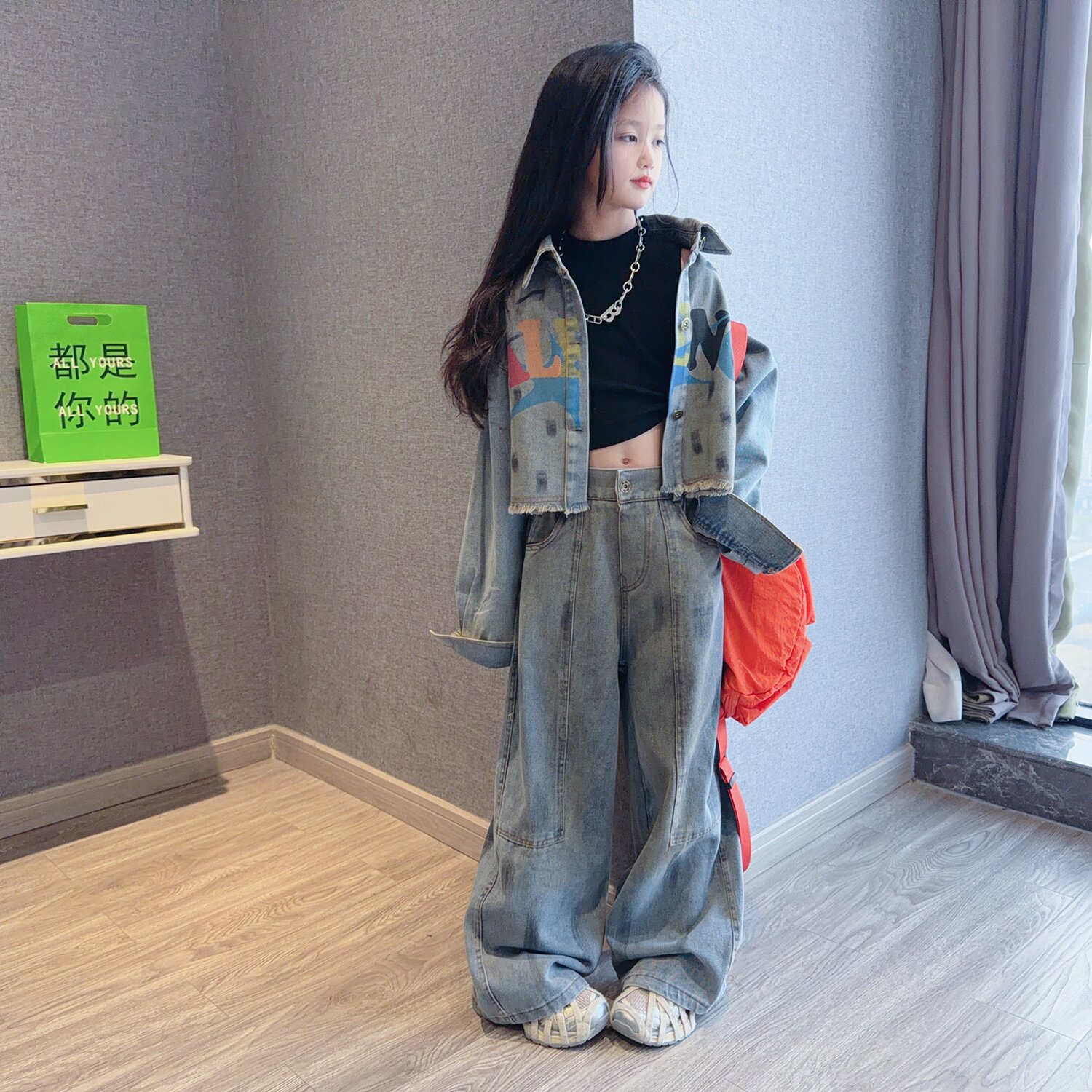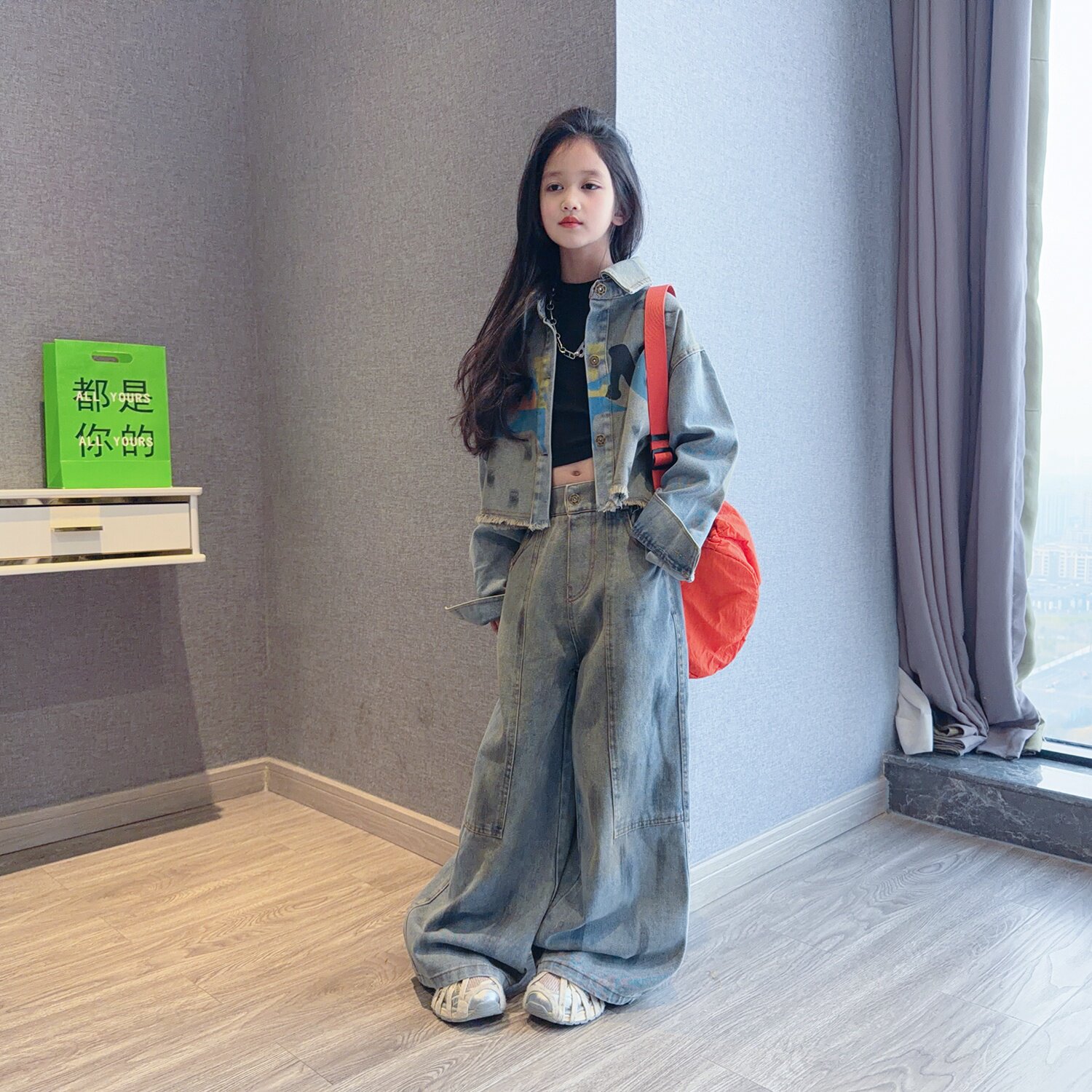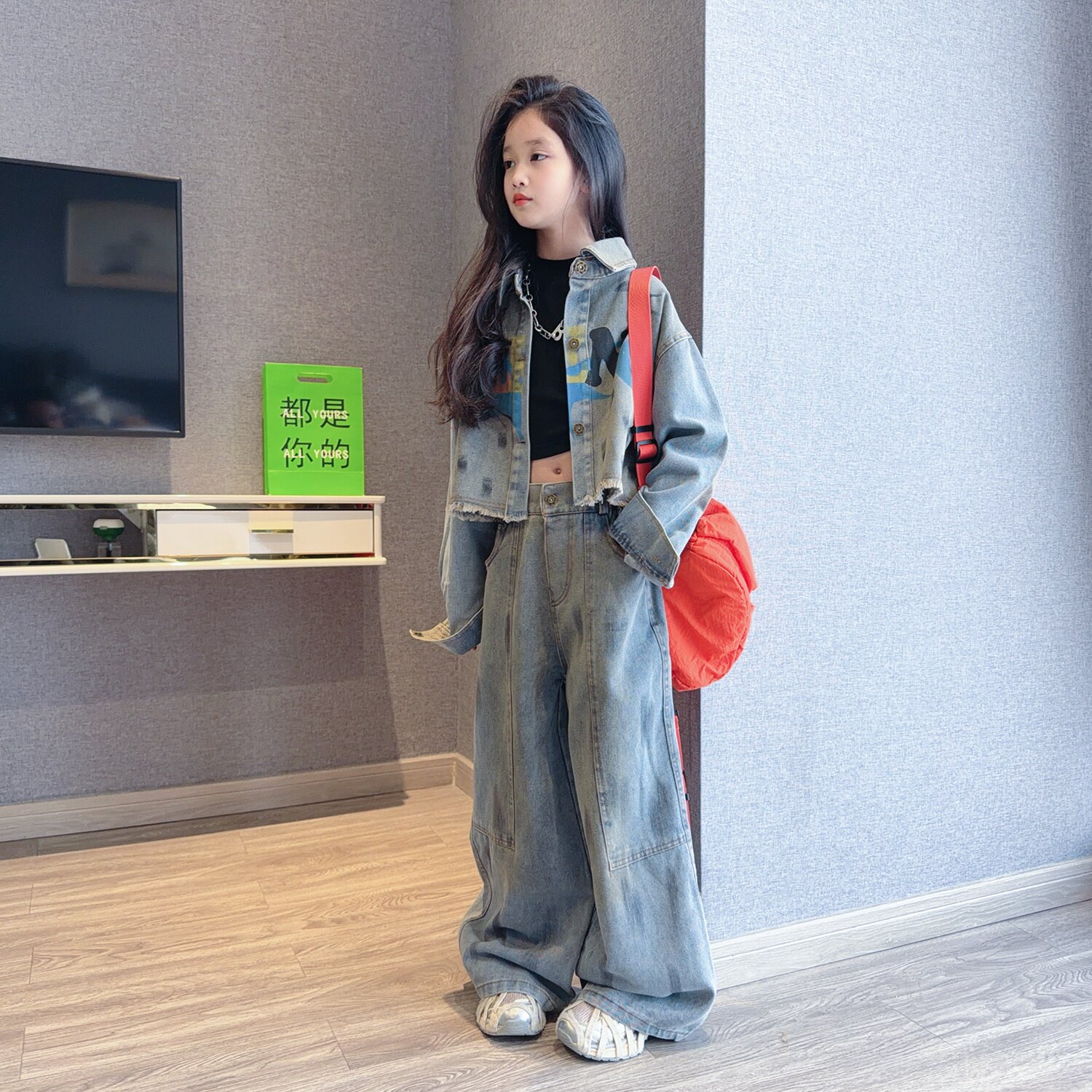 女童复古牛仔套装2026春装新款洋气女孩印花外套宽松阔腿裤两件套