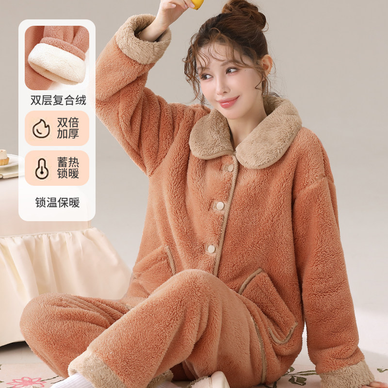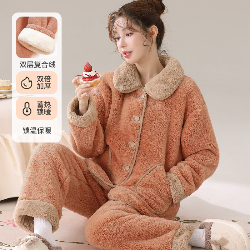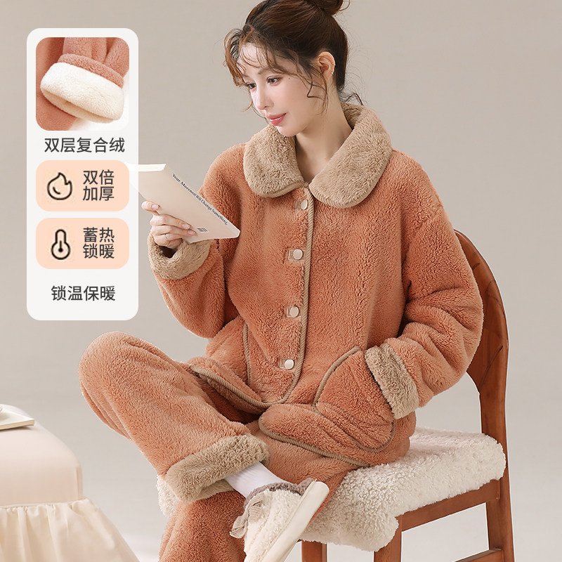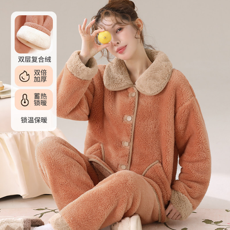 双层复合绒女士加绒加厚秋冬天可外穿法兰绒暖绒保暖家居服睡衣
