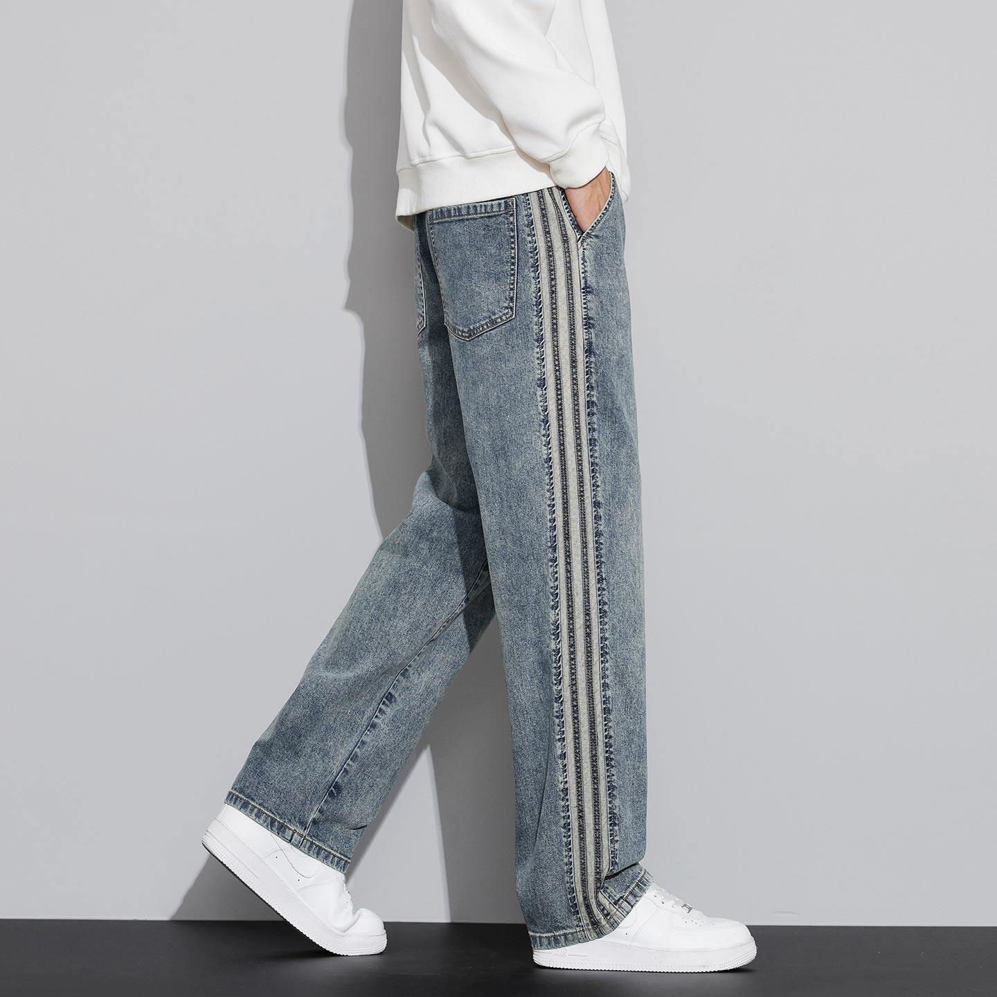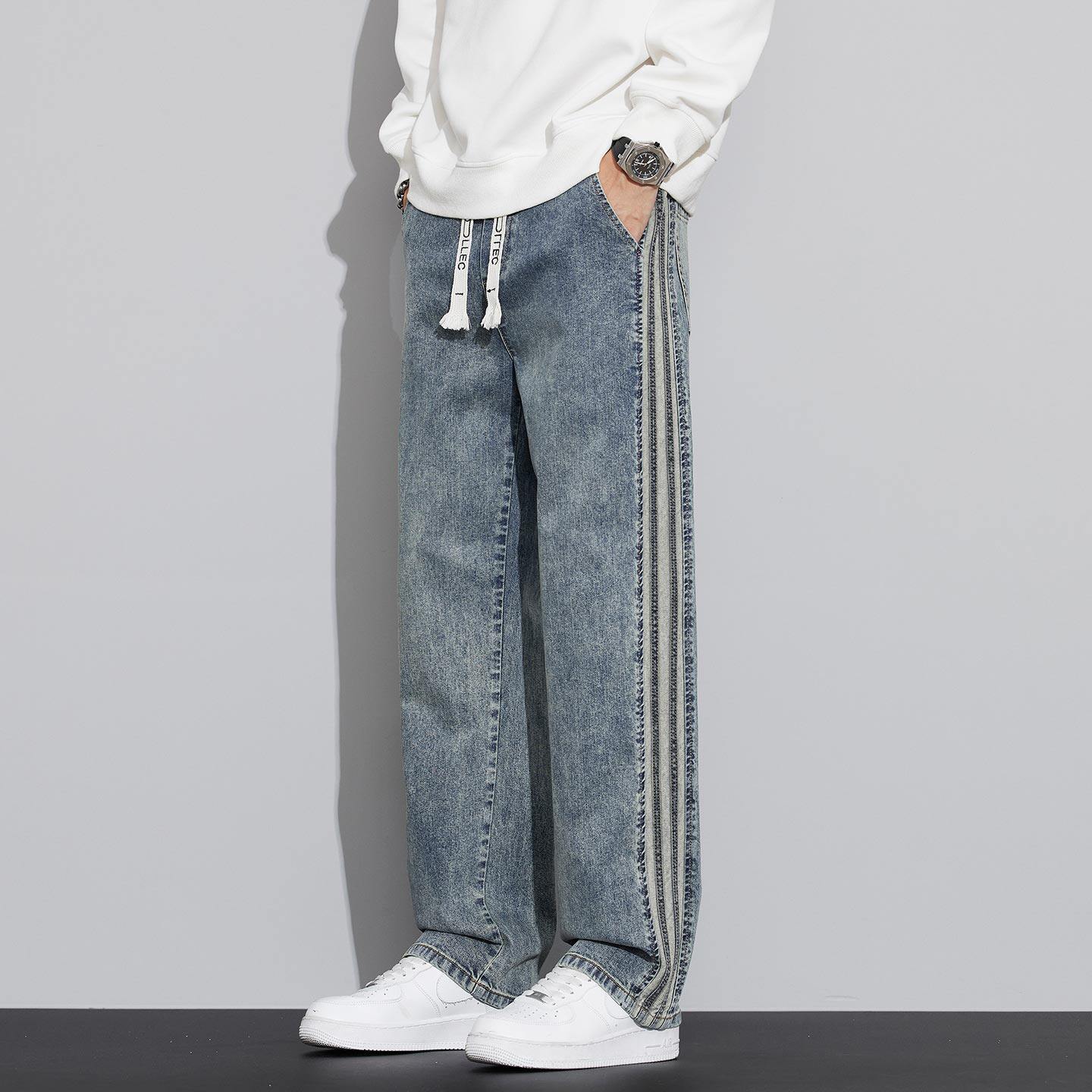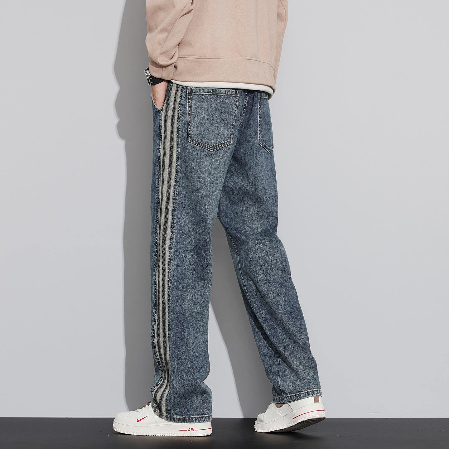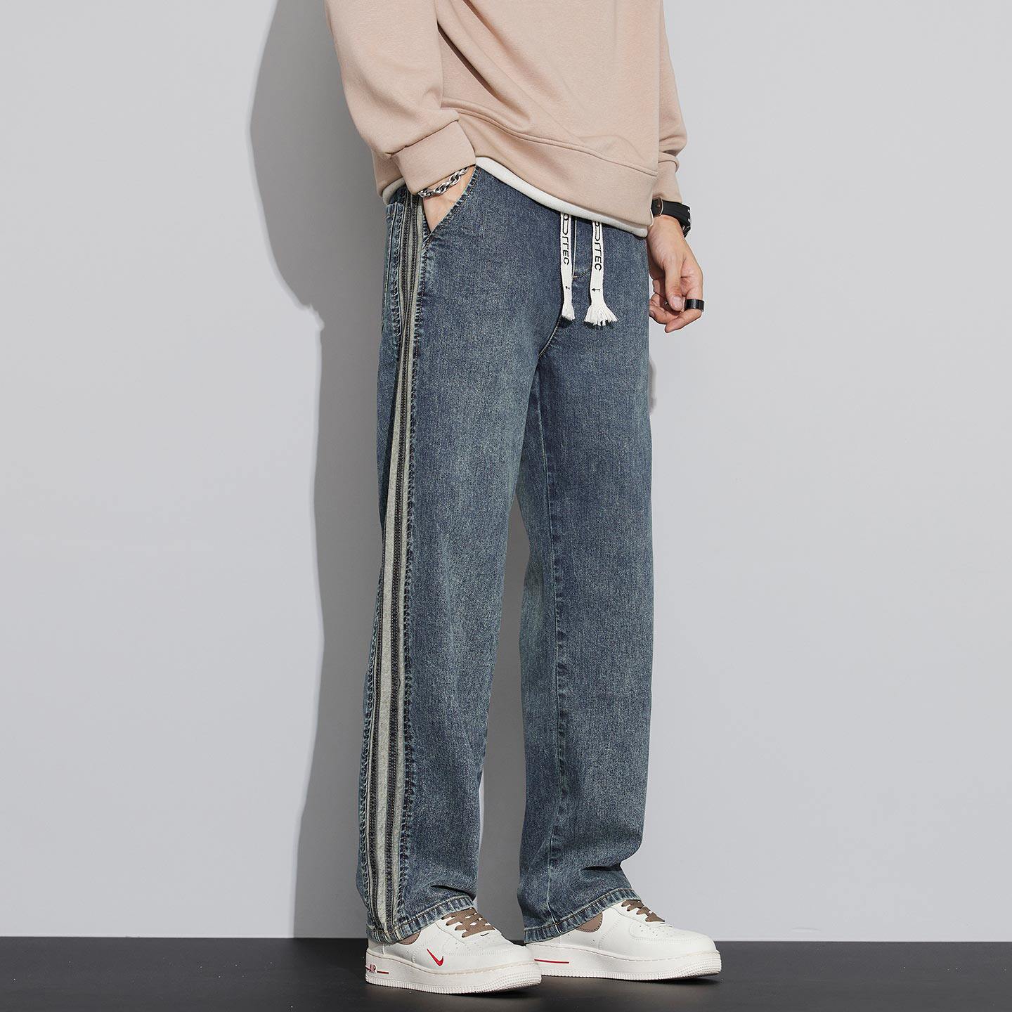 牛仔裤男款2026新款爆款侧边条纹宽松直筒裤春秋季抽绳松紧腰裤子
