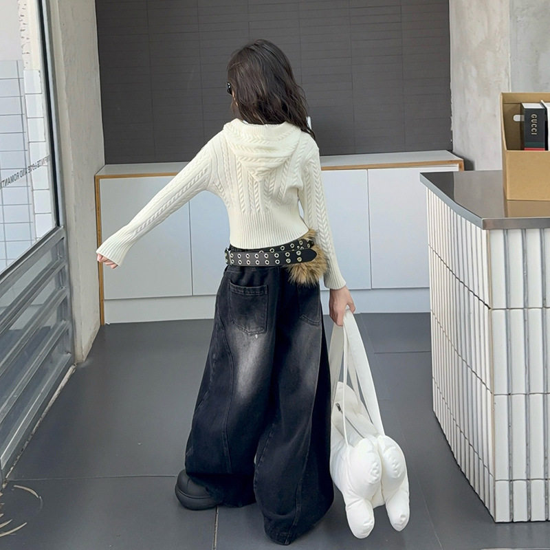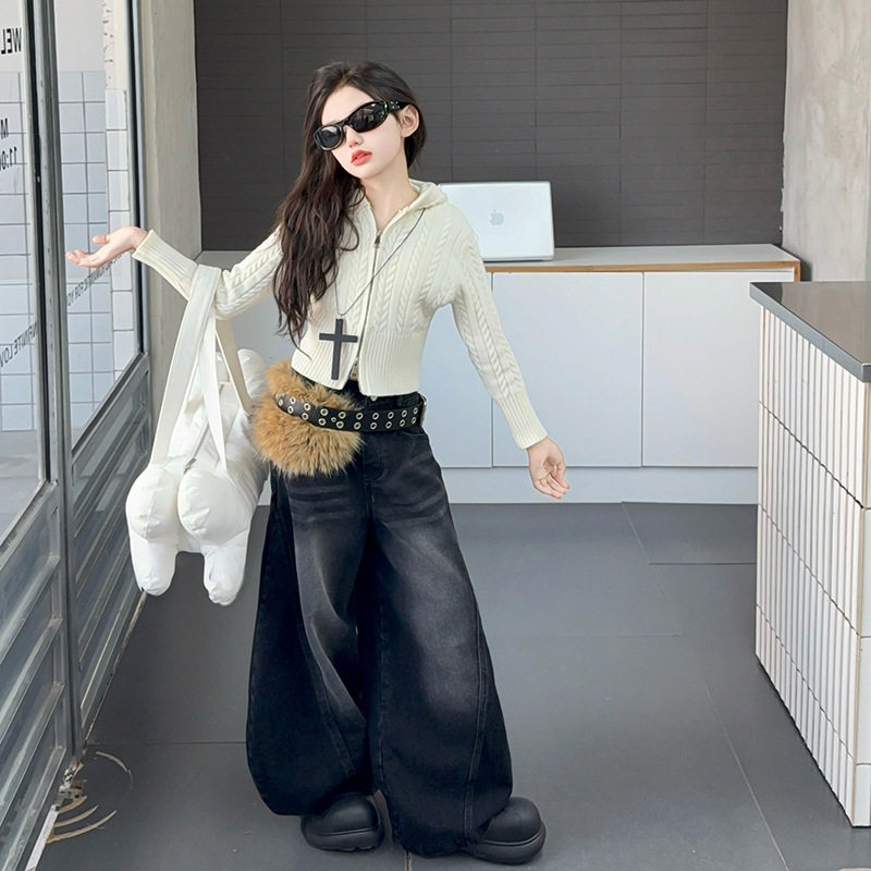2026春新款连帽拉链针织开衫女童韩版长袖时尚麻花毛衣牛仔裤套装