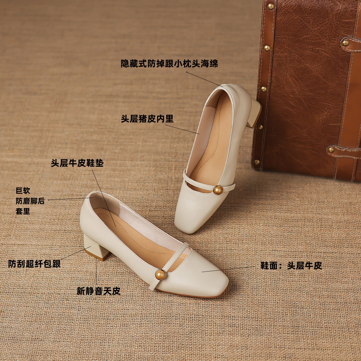 真皮单鞋女旗袍春秋粗跟法式玛丽珍中跟温柔方头复古浅口软高跟鞋