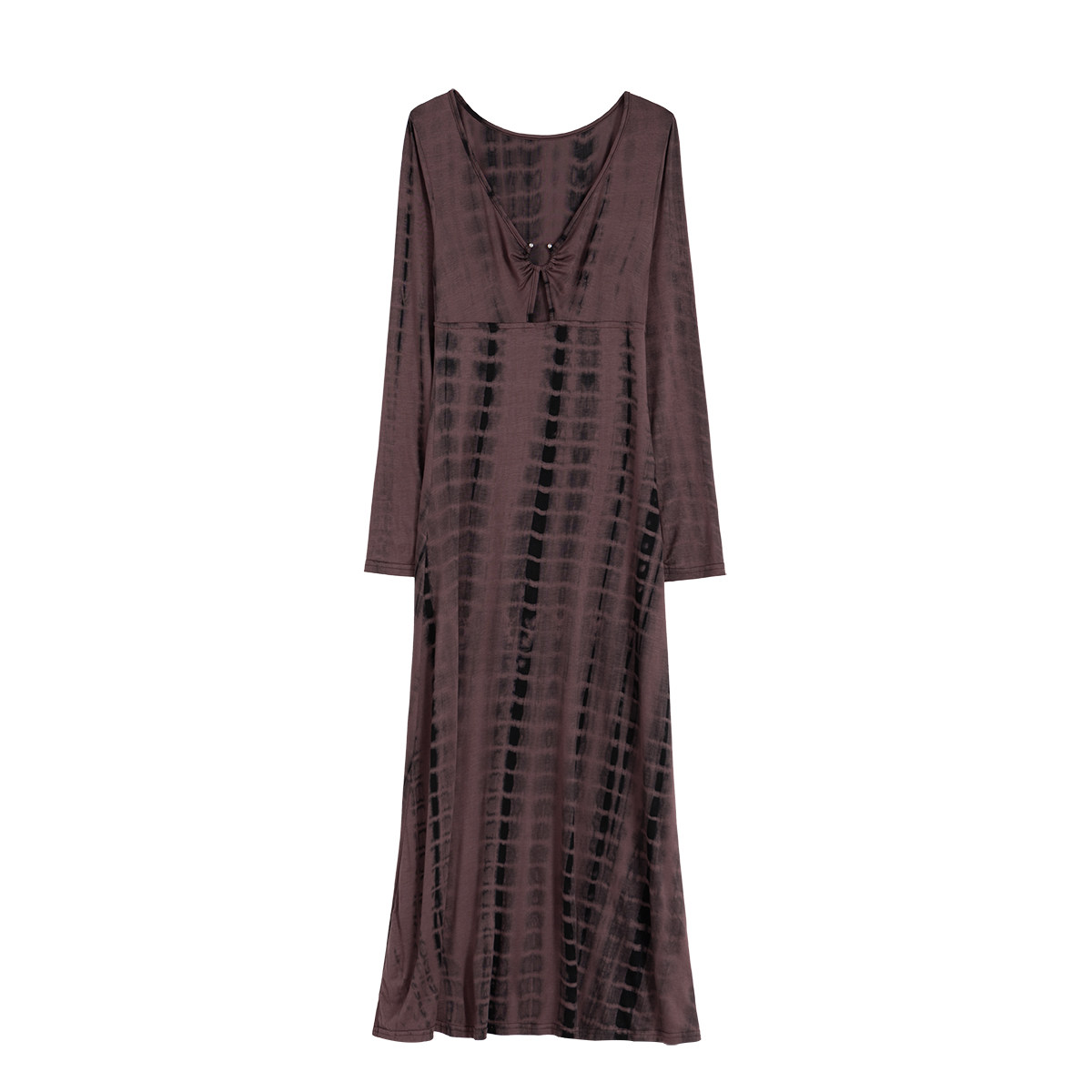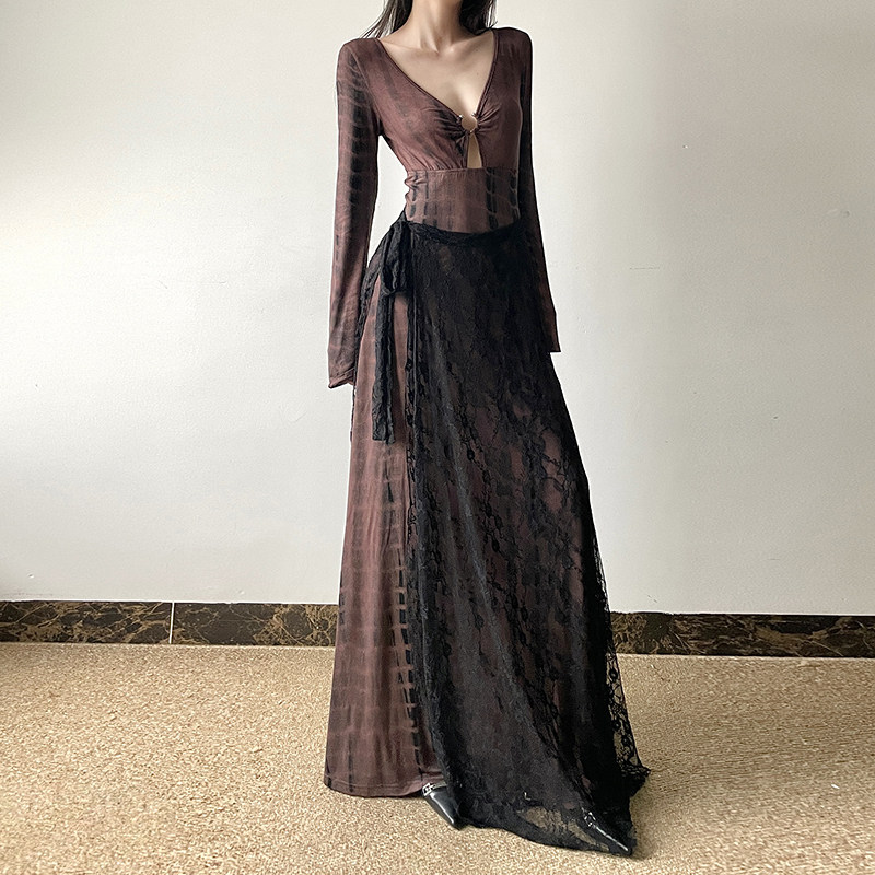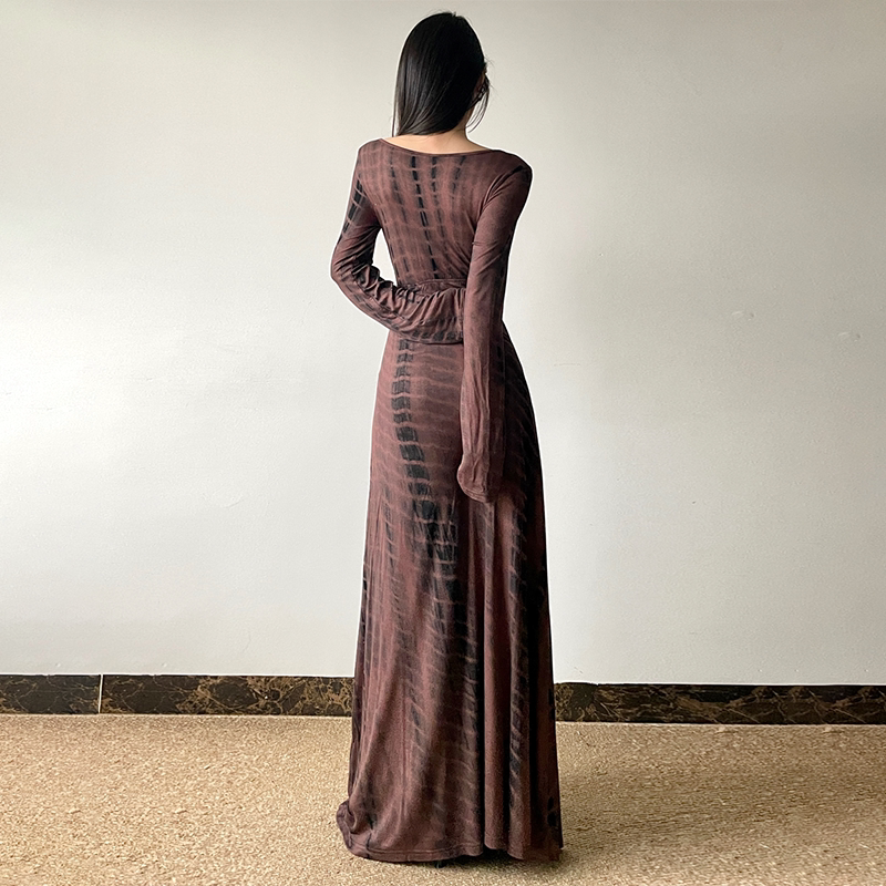 gagaopt秋冬季新款性感深V领收腰长袖连衣裙复古晕染显瘦A字长裙