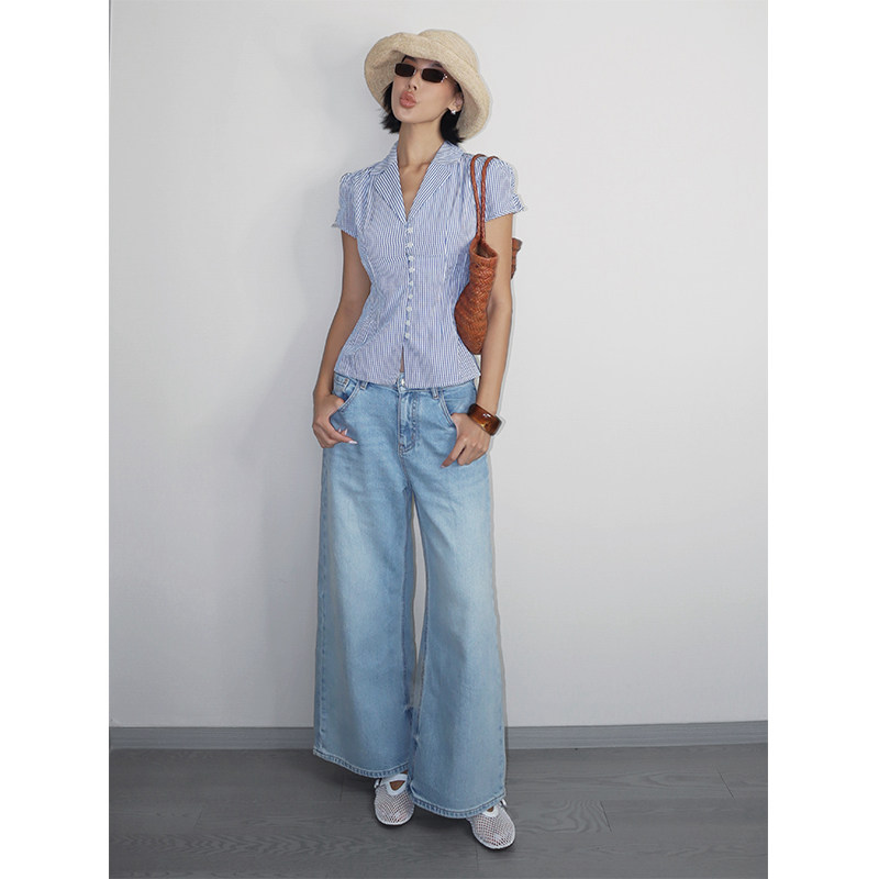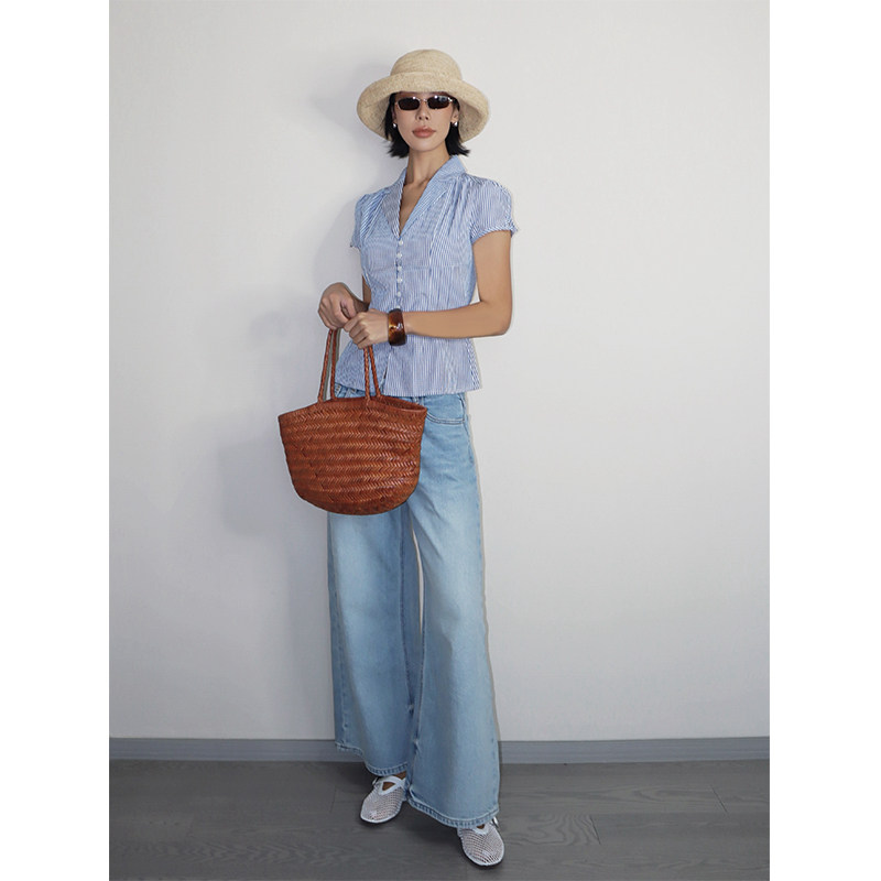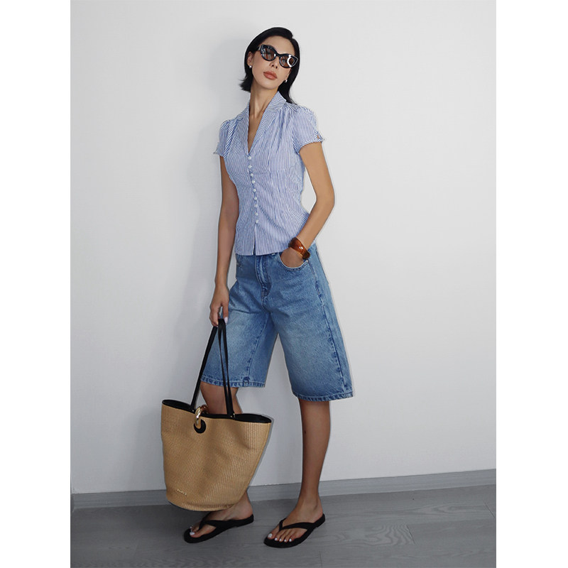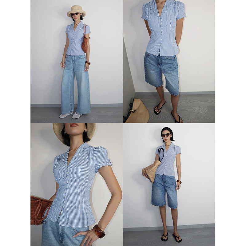 【5折】 蓝色格纹V领掐褶衬衫女法式收腰纽扣度假风短袖衬衣