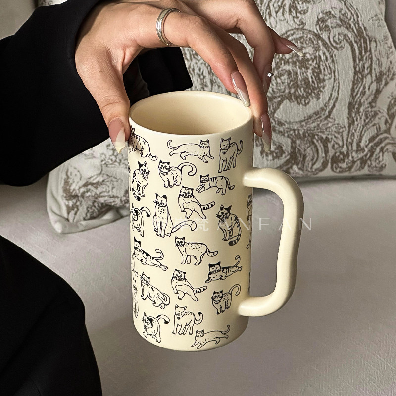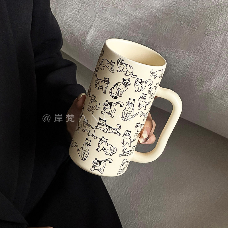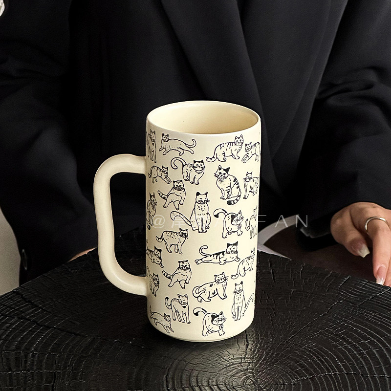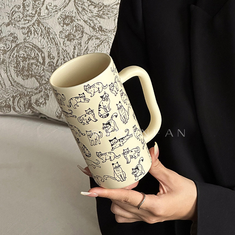 ins风情侣早餐杯马克杯简约团团猫咪杯卡通大容量杯陶瓷咖啡杯