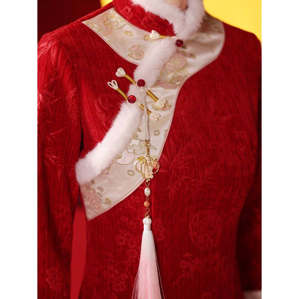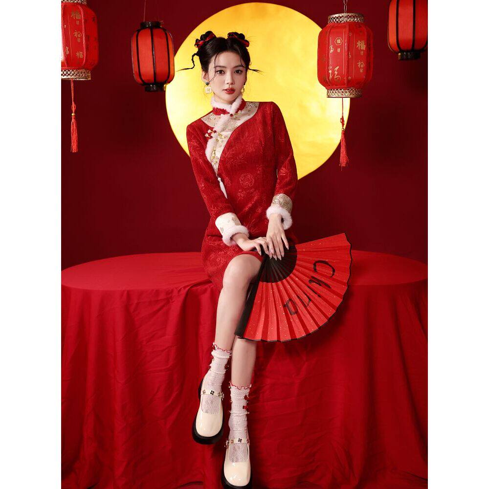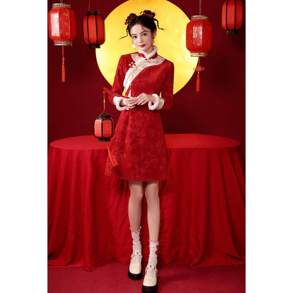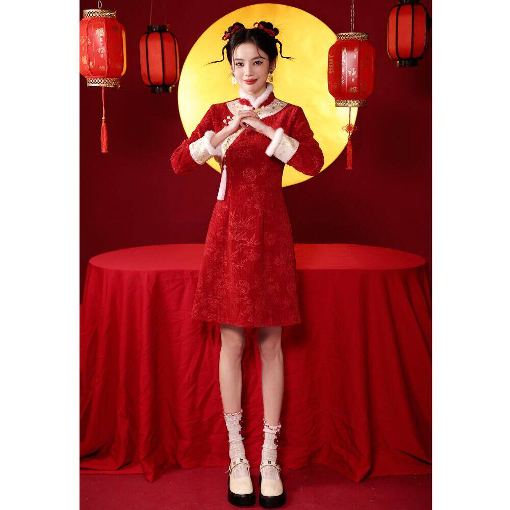 红色旗袍秋冬季小个子短款新年战袍过年衣服拜年服喜庆女装连衣裙