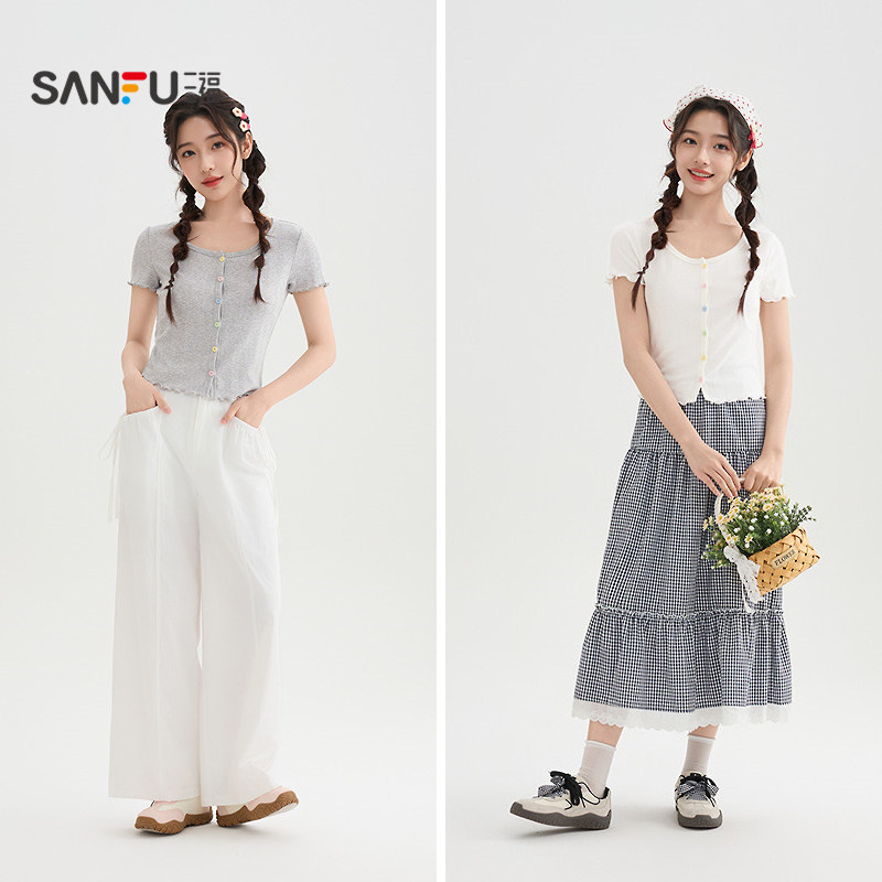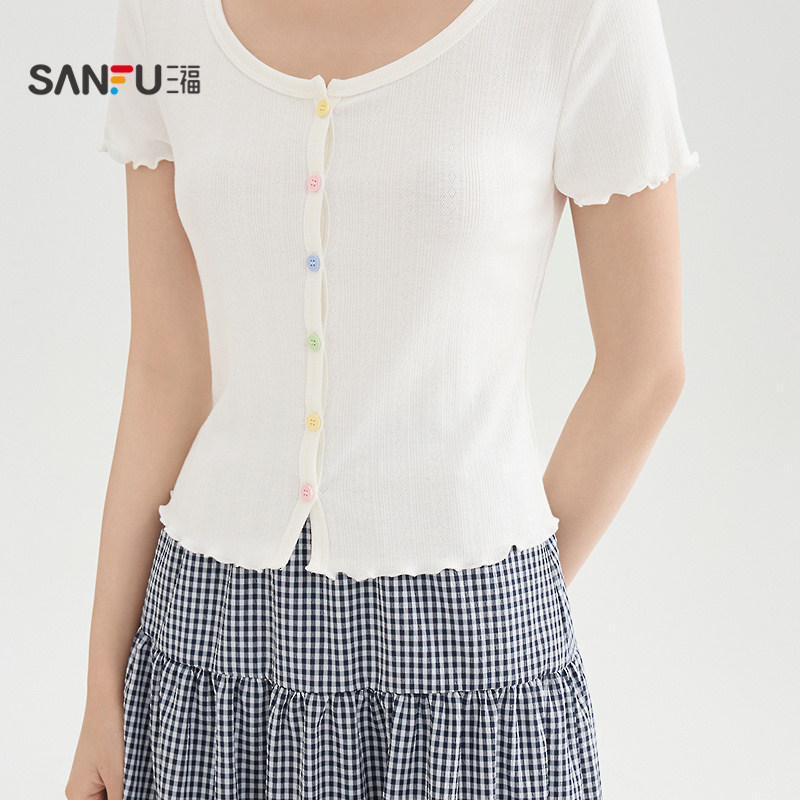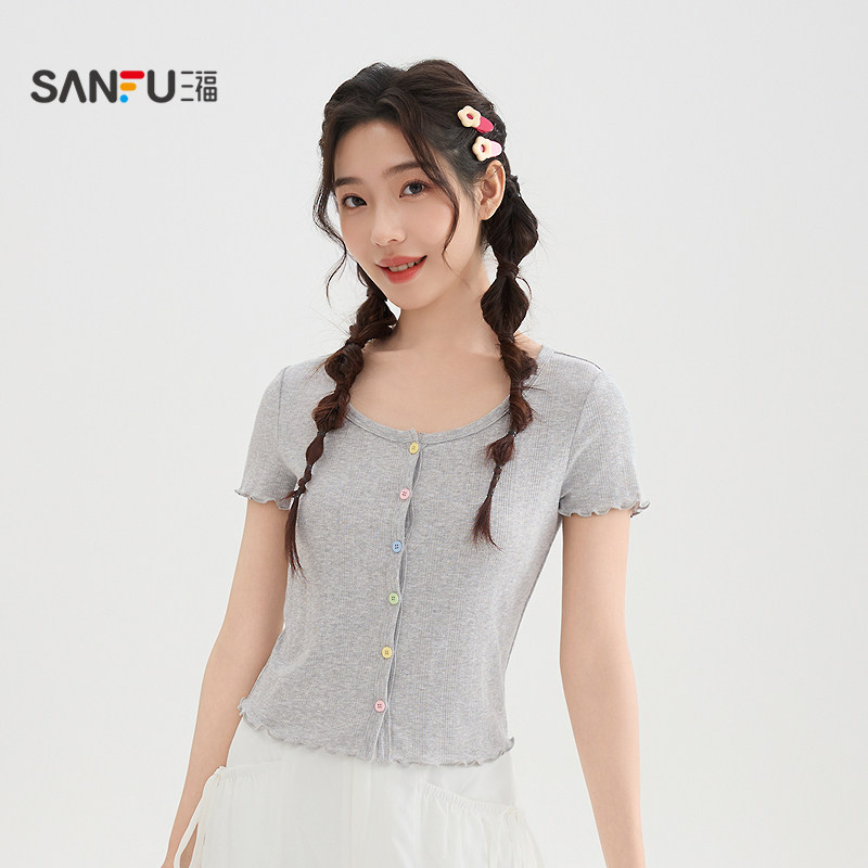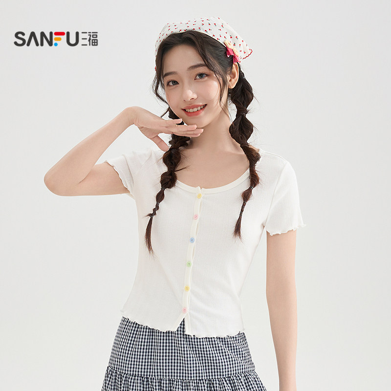 三福短款上衣女2026新款夏季减龄木耳边短袖小个子t恤女装521258
